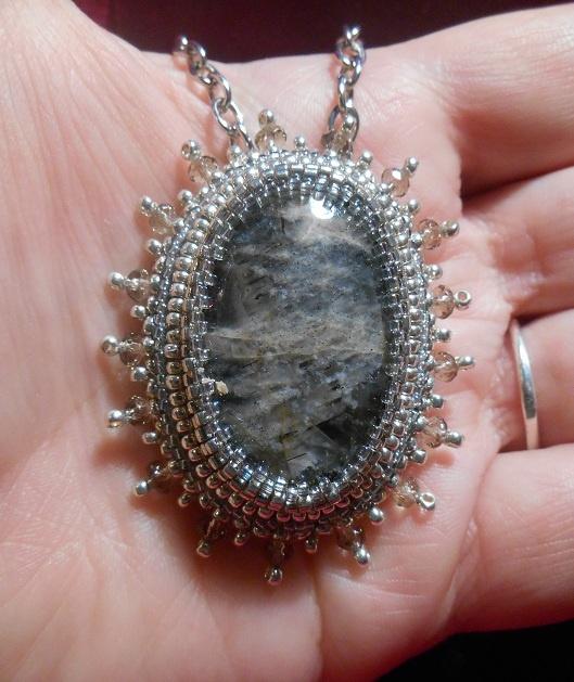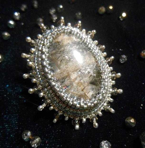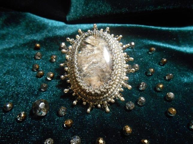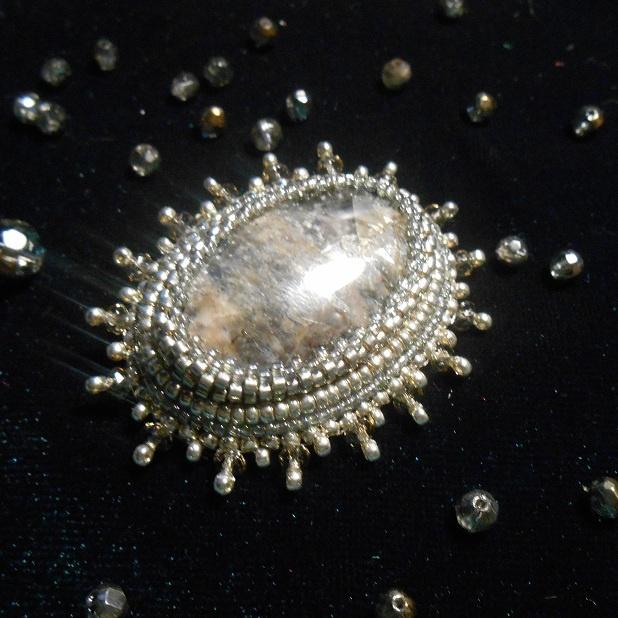 А-а-а, забыла — серебряный бисер это чех. Зная о его гадской способности облезать и темнеть я аккуратно закрыла камень плёночкой и всю оправу покрыла акриловым лаком из баллончика, чтобы неповадно было