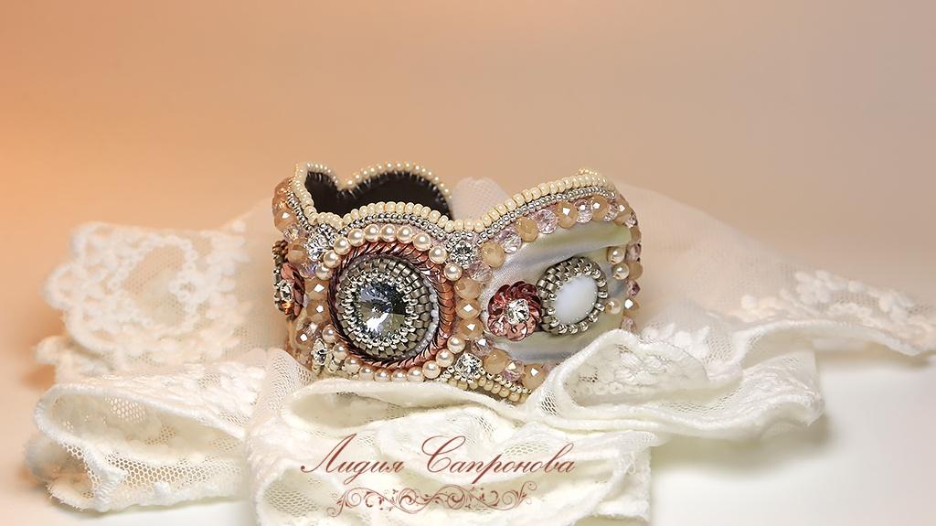 Браслет вышит на моделируемом фетре — держит форму без основы — легкий, пластичный. Обратная сторона — мягкая натуральная кожа бордового цвета.