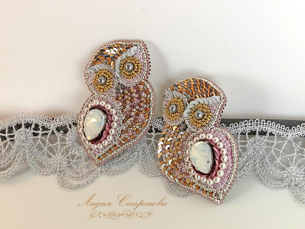 Брошь с кристаллом Swarovski белого опалового цвета. Овал окружен французскими пайетками и жемчугом Сварвоски. Элегантаная Совушка вышита мельчайшими французскими пайетками, драгоценным серебряным бисером miyuki. Золотисто-серебристые перышки Совы переливаются, блестят. Брошь выдержана в светлых тонах. Обратная сторона — итальянская кожа серебристого цвета. Основа для броши — булавка. Размеры — 5,5 х 4см.