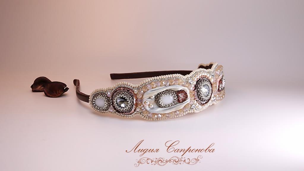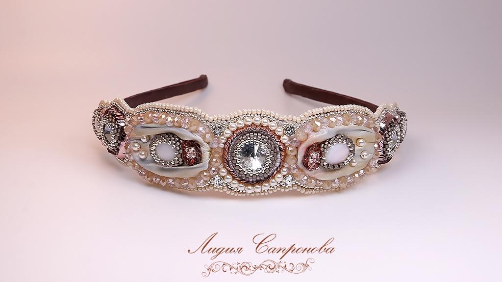 Ободок с кристаллами Сваровски и шелковой лентой шибори. В работе так же риволи цвета Blue Shade, перламутры, чешские бусины рондели, драгоценный серебряный бисер, жемчуг Сваровски, французские пайетки. Нежные цвета позволят украсить прическу невесты. Металлическая основа полностью обтянута кожей. Обратная сторона — мягкая натуральная кожа бордового цвета. Размер вышивки — 20,5х3,5см.