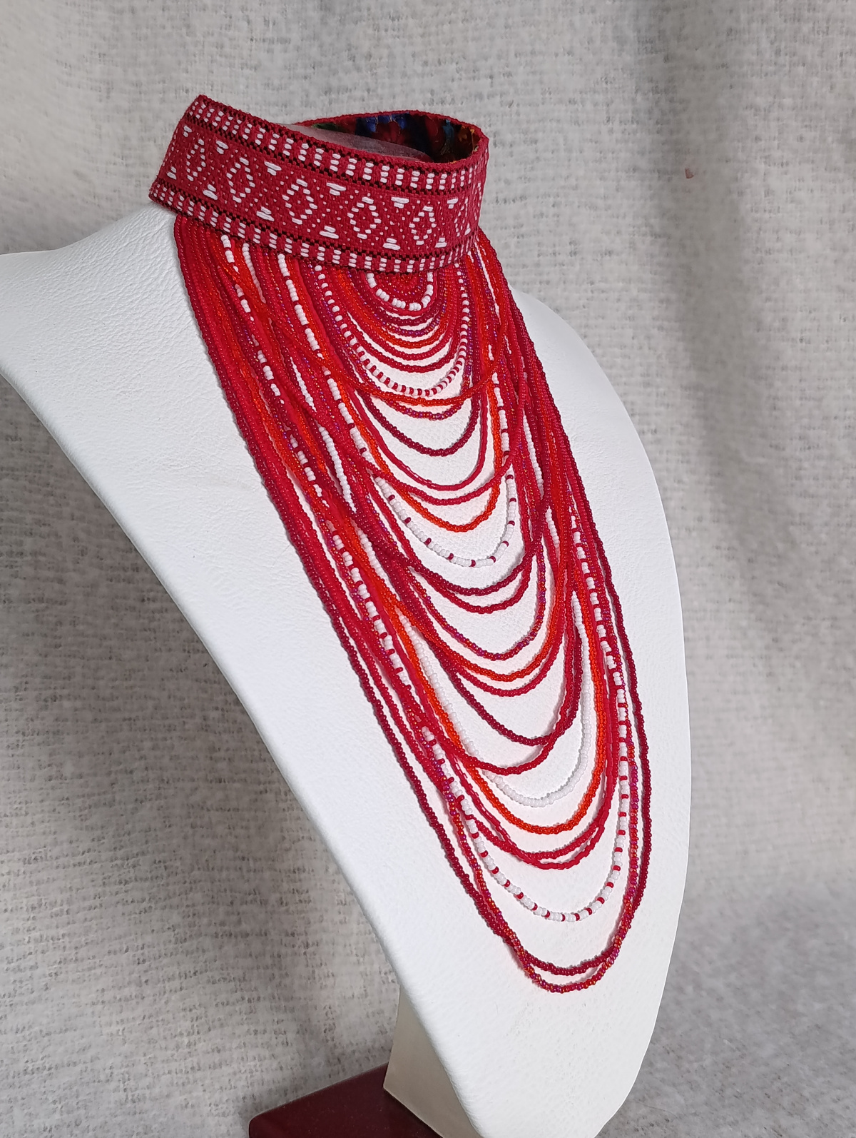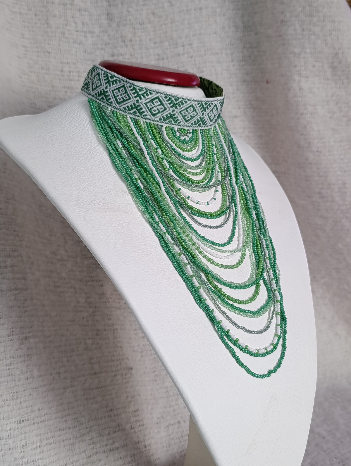 Поджерелки… Подобные украшения делались и носились в 19 в… Низание, закреплённое на ленту основу, у ленты есть изнанка из хб ткани, застёгивается на пуговку.