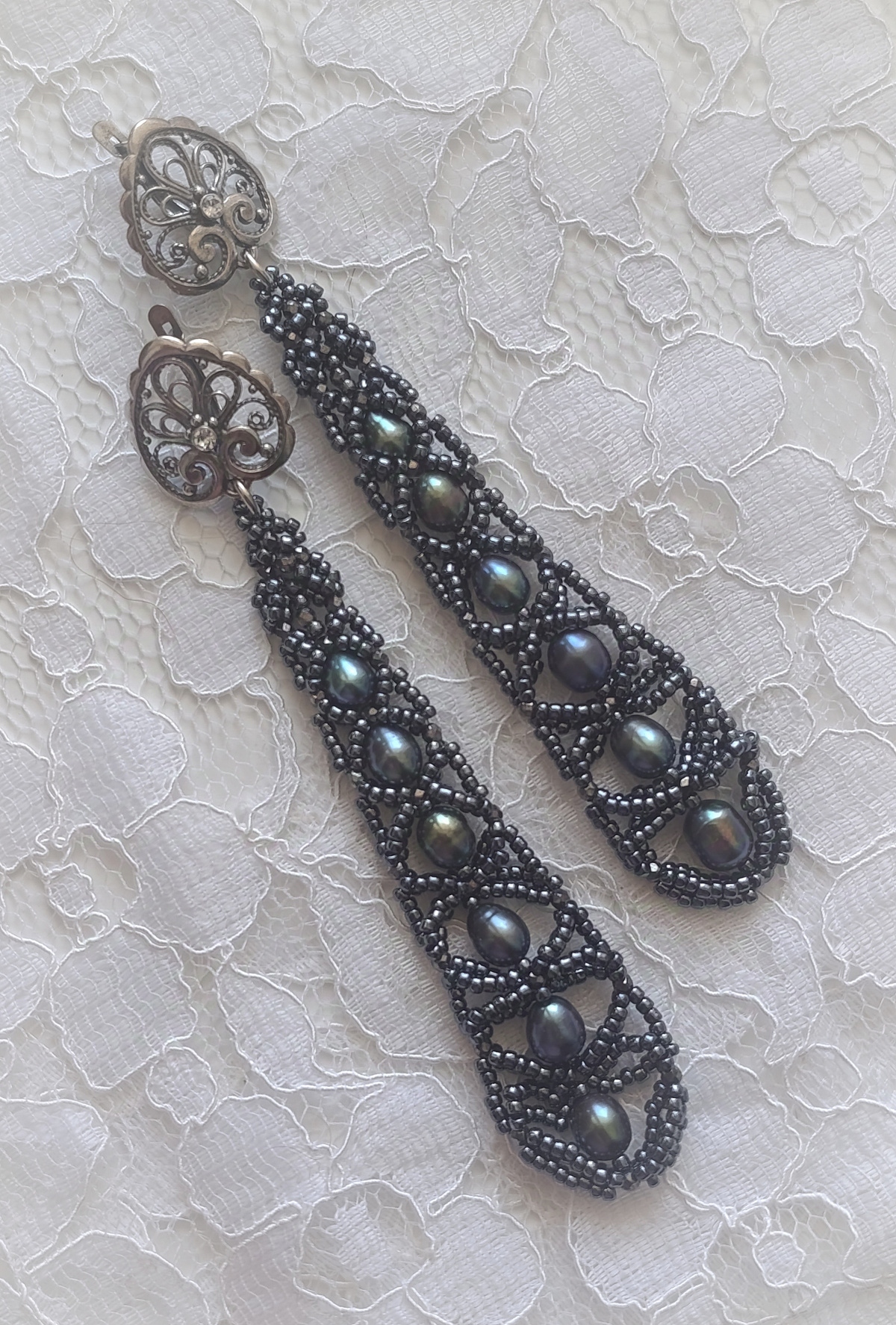 Серьги Поморские с чёрным жемчугом… Хотя вообще это были серьги из первой партии, плела для себя.