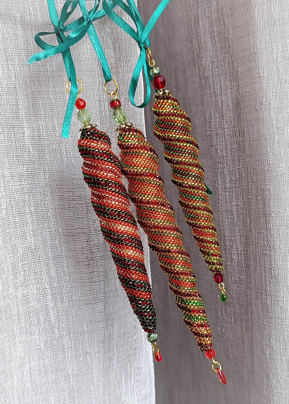 3 мм бусины вообще не встали в плетение, увы… и все эти сосульки с бусинами 2 мм, но 2-милиметровые бусины не дали рельефа буравчика и сама сосулька не получилась жёсткой, пришлось делать набивку. я сосульки наполняла полосками из целофанового пакета, просто набивала по ходу плетения. Но тем не менее с бусинами очень красиво получилось, сверкает и переливается на свету.