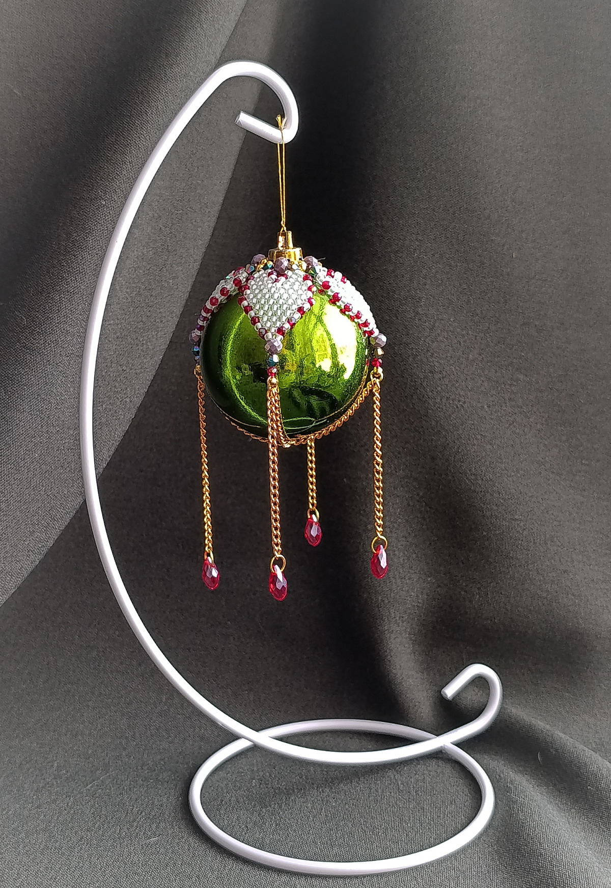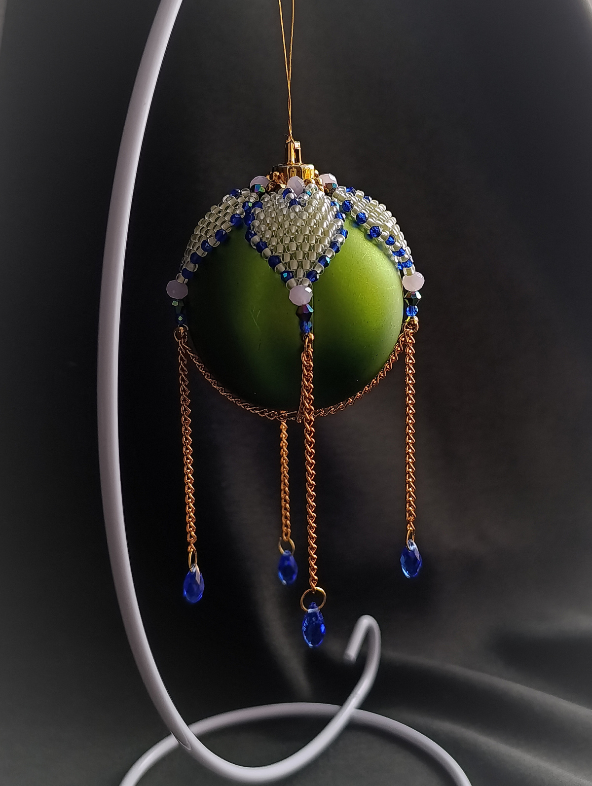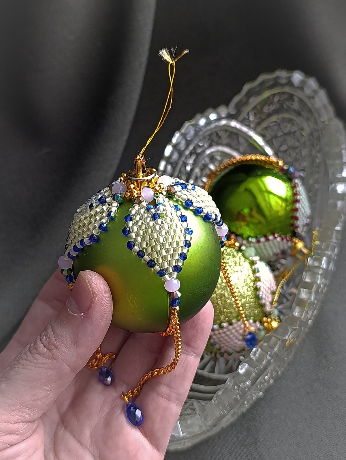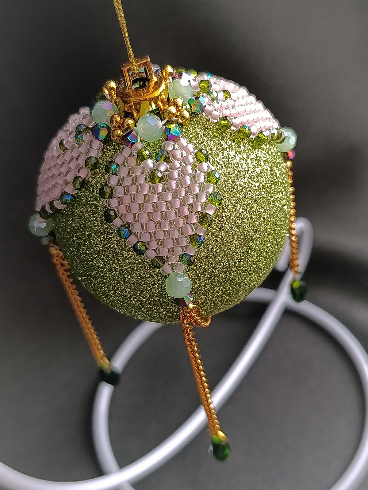 Сам декор из бисера 8/0 флуоресцентного, ну и плюс цепочки и капли…