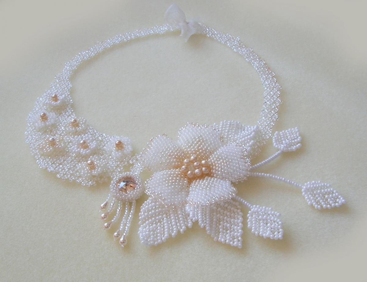 Сплелось вот такое колье в преддверии мая. То, что получилось, напомнило цветение яблони, хотя достичь определенной картинки цели не ставилось. На шейке фото пока нет, а на манекене окружность шеи великовата, потому лежит под горлышко, а на самом деле чуток ниже. Ну смотря на какой шейке, конечно.