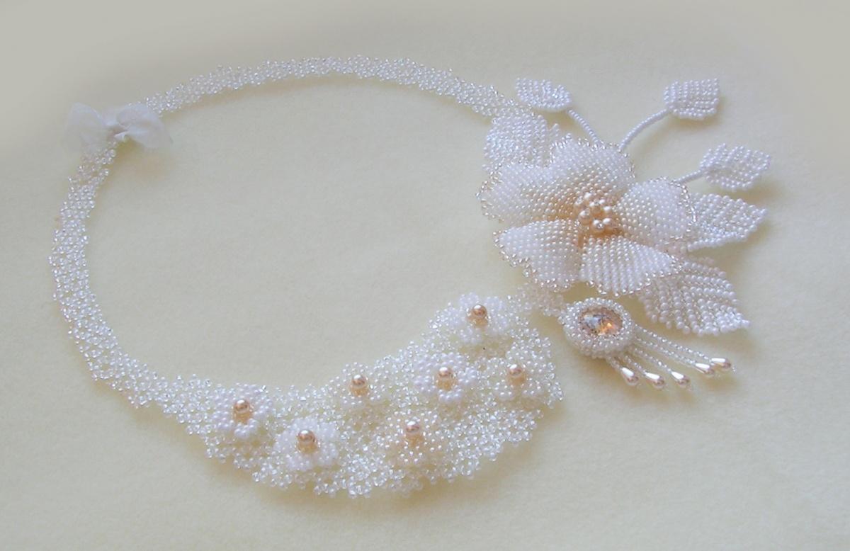 И фотографии замечательные. Но не хватает всё ж контрасту. То ест не белое на белом, а хотя бы — на сером. А можно и на чёрном. ну хоть одну фоточку. Что б ещё больше это колье раскрыть. В душЕ