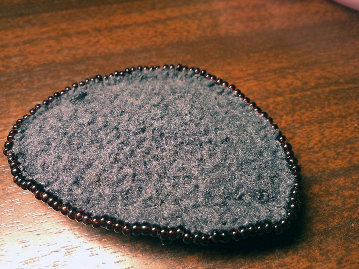 Изнанку (кожу) так же обшиваем заделочным рядом бисера. Перед тем, как это сделать, я решила (впервые, и буду впредь