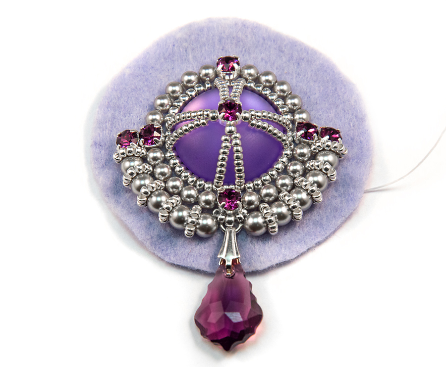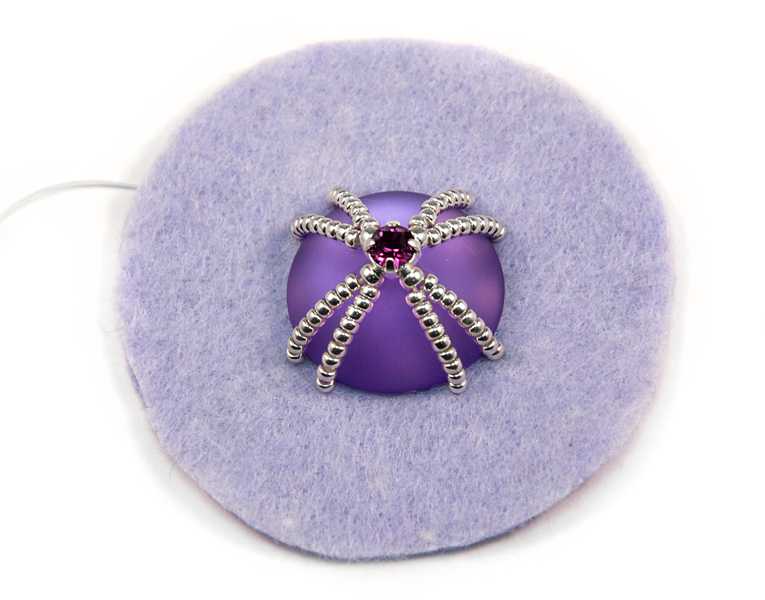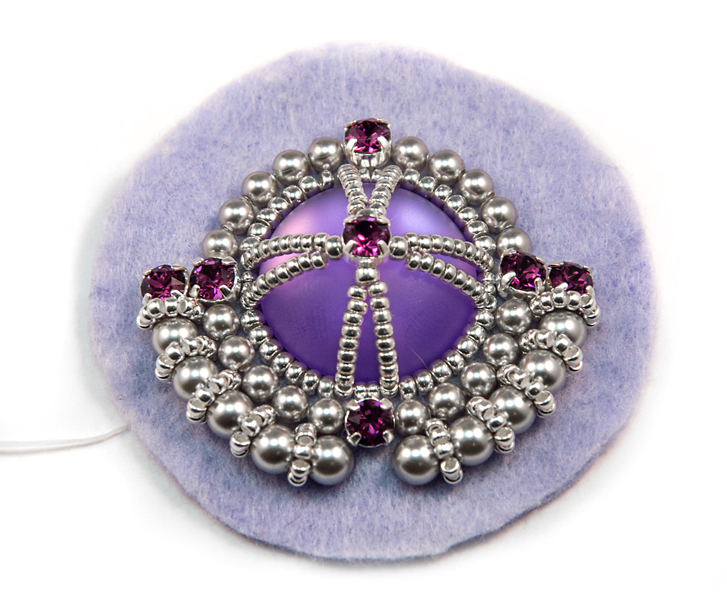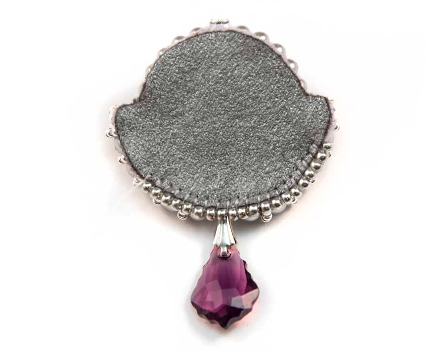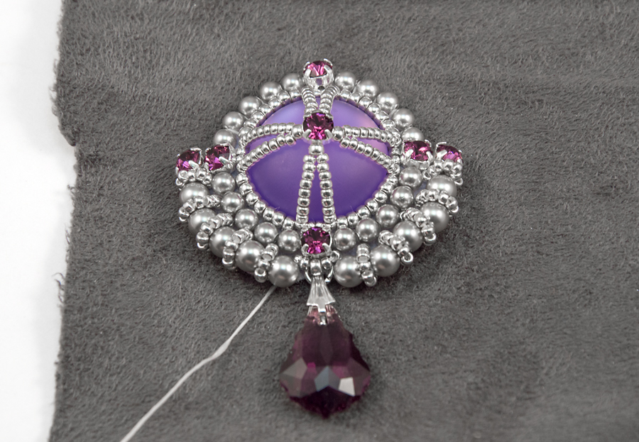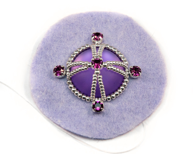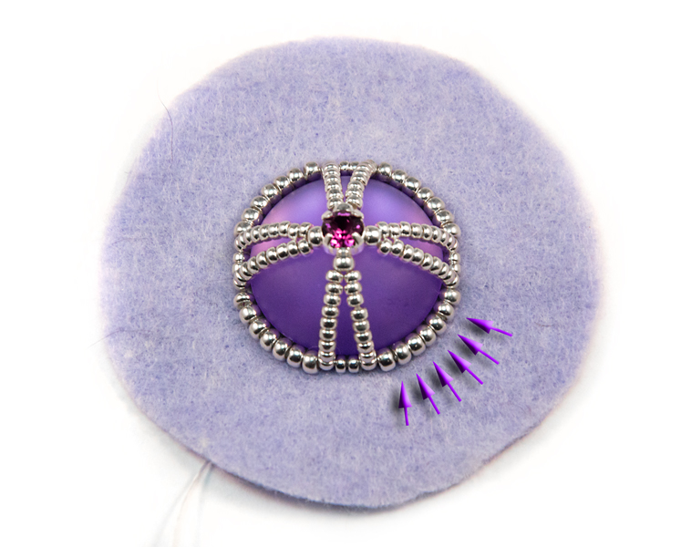 7. Вокруг кабошонапришиваем бисер. Сначала просто набираем в узких местах по 2 пятнашки, в широких — по 7 круглого Миюки 11/0. Нить нужно вести под бисерными мостиками. После пришиваем каждую бисеринку методом «вприкреп» (нить выходит между бисеринами с внутренней стороны и снова входит с внешней), и так по всей окружности.