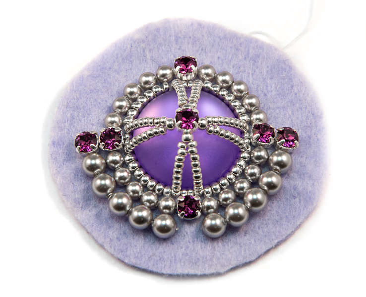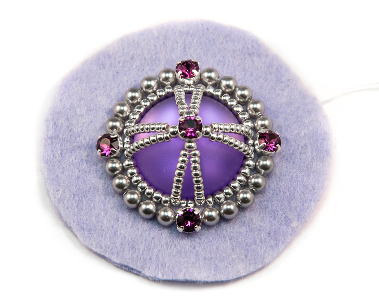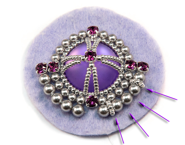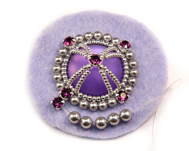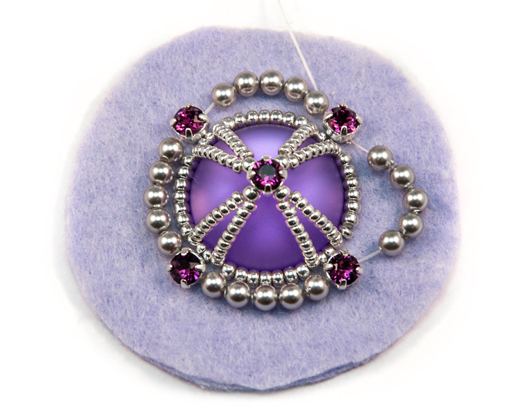 9. Проходя нитью через оправу шатонок набираем по 5 жемчужин Сваровски 3мм каждую четверть круга: