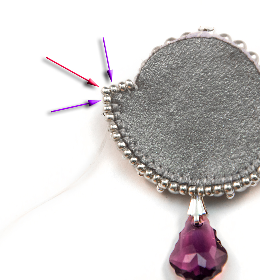 24. Доходим до уголка, набираем сразу две бисеринки (отмечены фиолетовыми стрелками), потом дошиваем еще пару бисерин, возвращаемся и вставляем между первыми двумя бисеринами еще одну (выделена красной стрелкой) — получили острый уголок:
