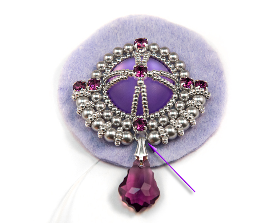 27. Сначала закрепляем короткий центральный отрезок цепочки. Он крепится между жемчужинами 3мм (не между бисеринами заделочного ряда). Второй кусочек цепочки закрепляем между угловыми бисеринами заделочного ряда и соседними (см. п.24, между бисеринами, которые выделены верхней фиолетовой и красной стрелочками).