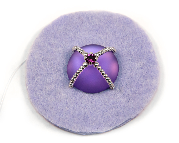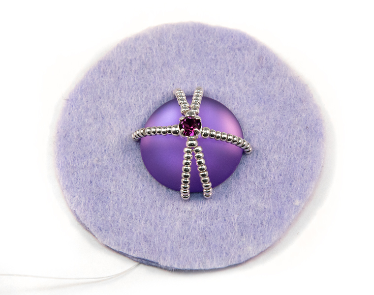 16. Поверх колечка добавляем 5 бисеринок: 4 штуки размера 15/0 и одну 11/0 по центру.Центральную бисерину пришиваем дополнительно прямо по центру колечка.