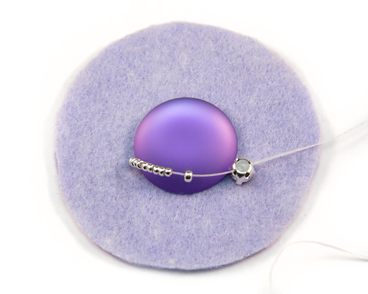 2. Набираем 9 бисерин Миюки размера 15/0, одну 11/0 и один Chaton 4мм: у шатона в оправе четыре отверстия, проходим нитью через противоположные: