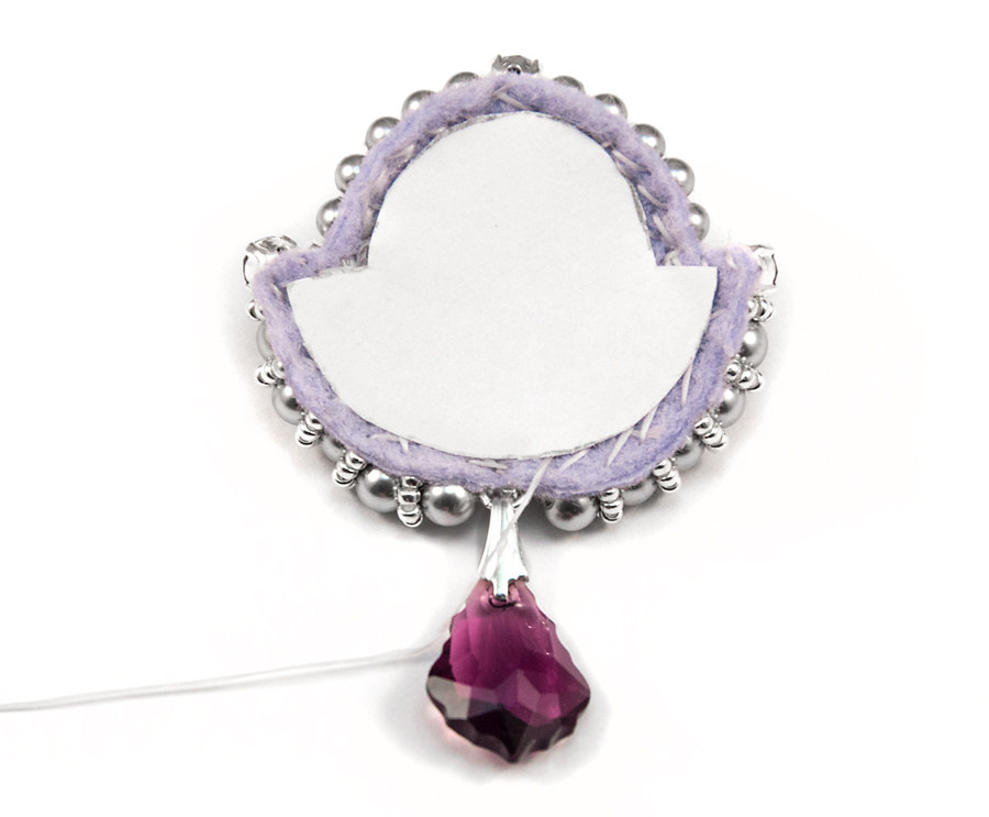 нужно разомкнуть и сомкнуть снова, чтобы вставить в него бейл (я обхожусь обычным пинцетом). Пока оно в разомкнутом состоянии — продеть под нити центральной шатонки. Пришиваем колечко дополнительными стежками.