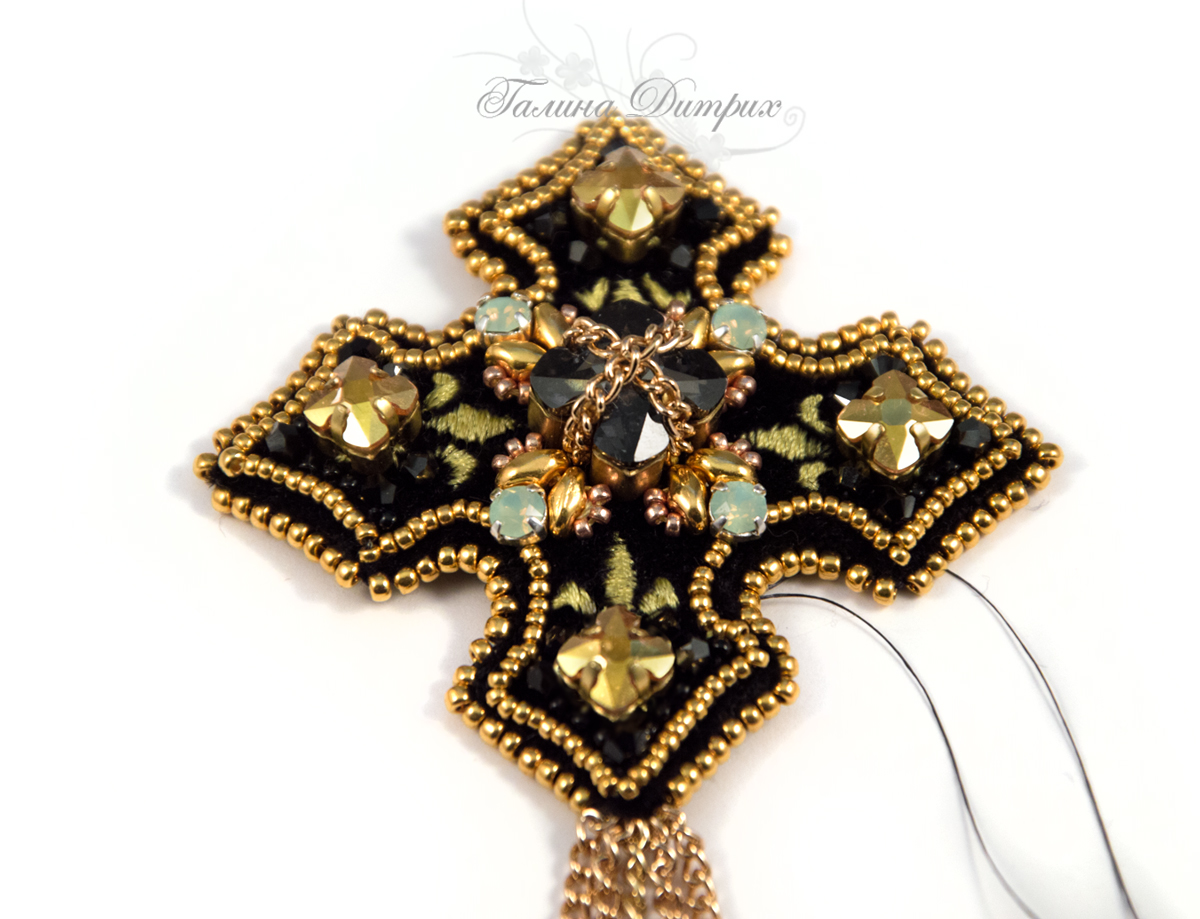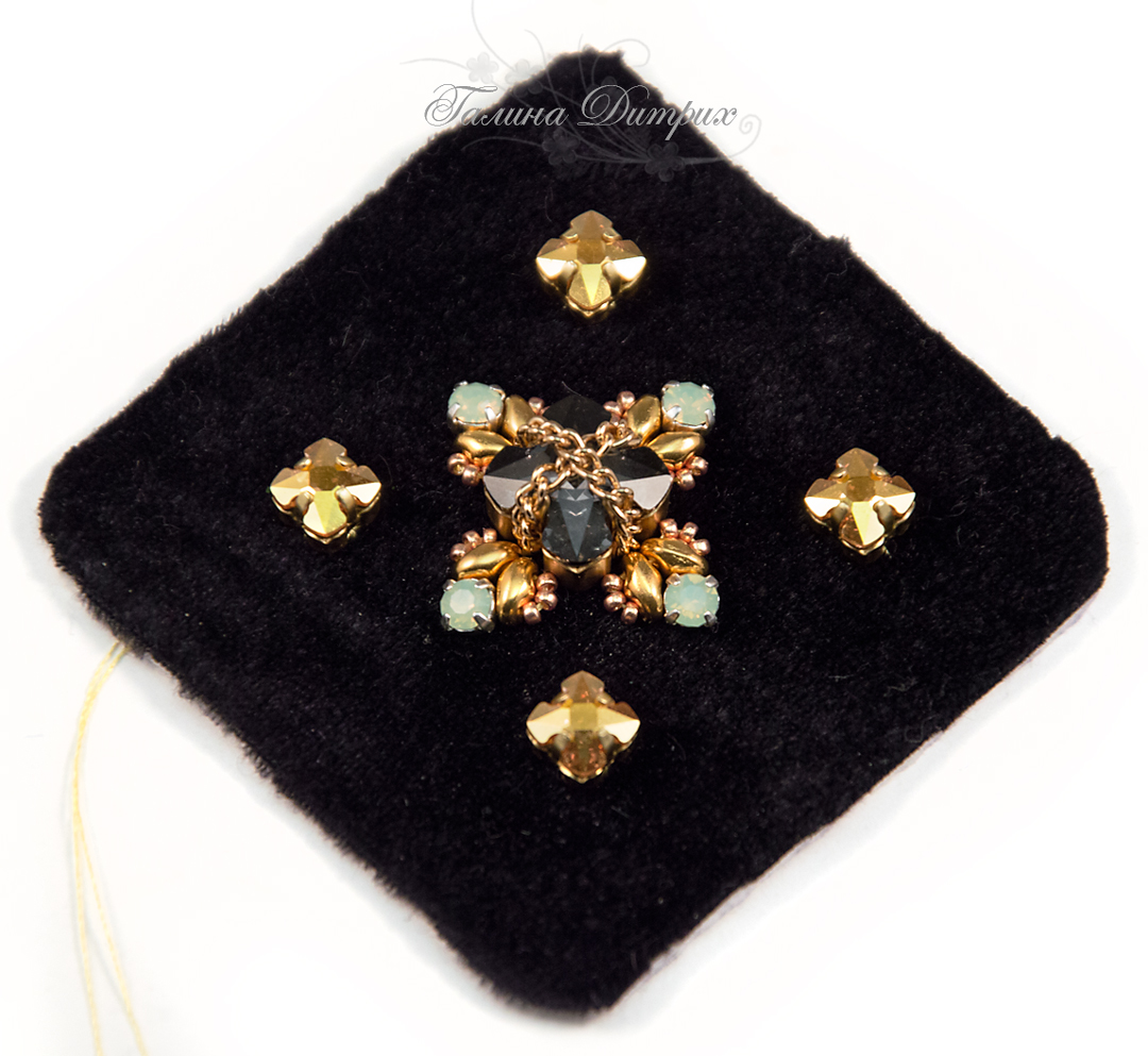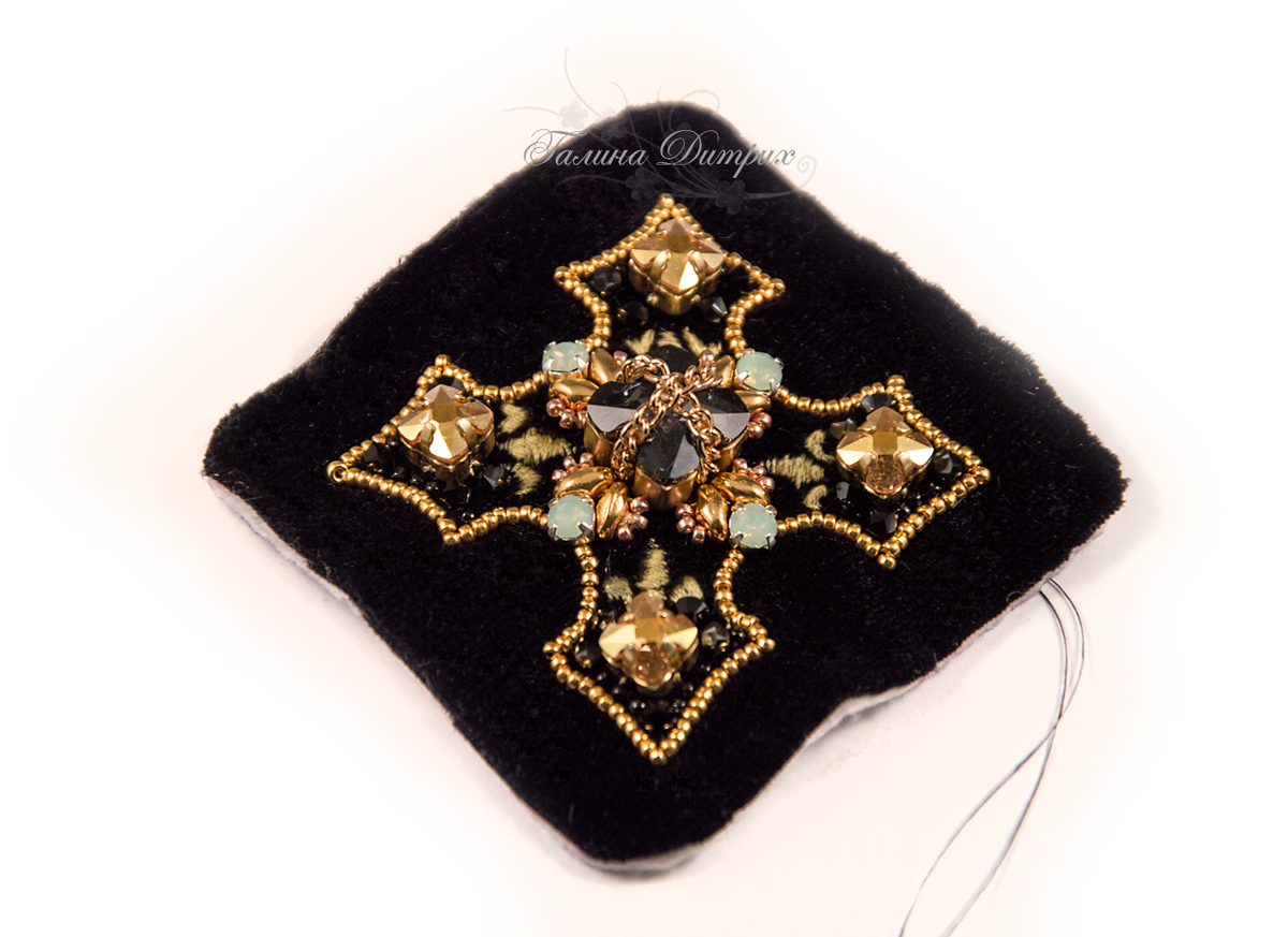 5. Пришиваем остальные элементы: 4 креста размера 8 мм (тоже в оправах). Их расположение размечено ранее на изнанке. По четырем сторонам центрального креста пришиваем Супердуо и Chaton Montees 4мм. По граням Supderduo добавляем бисер 15-го размера (не вышивкой, а плетением, как в МК «Червонная дама»).