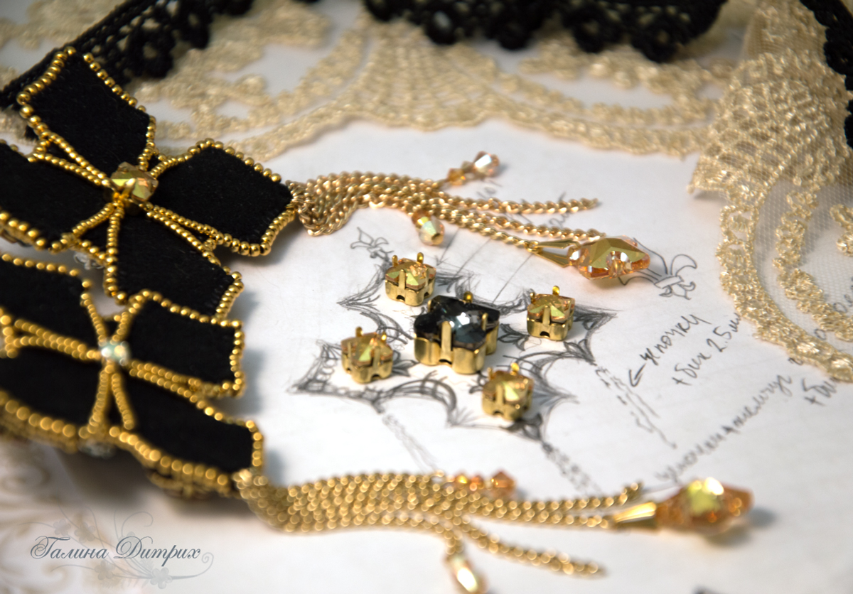 8. С внешей стороны маленьких крестов добавляем черный глянцевый бисер и гематитовые биконусы Сваровски 3мм. В статическом положении черное на черном почти не видно, зато хорошо видно рельеф и блеск граней при движении. Таким образом весь бархат закрыт, кроме как между лилиями и центральным крестом.