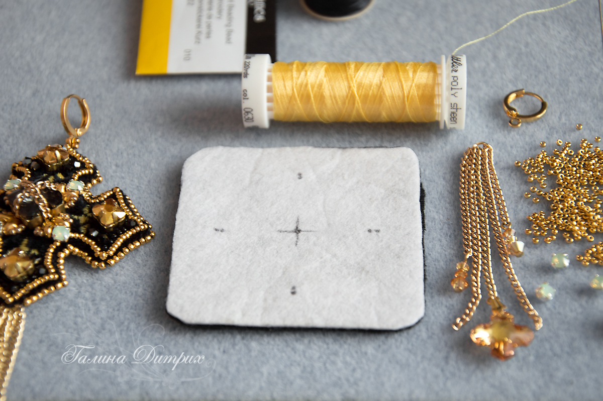 11. Оформляем край: обшиваем бисером Миюки размера 11/0. Как обшивать край, оформлять и уплотнять изнанку, — рассматривается в п.15-22 в МК Серьги «Версаль». В самом нижнем углу креста между слоями бутерброда вшиваем соединительное колечко, на котором крепится вся подвеска.