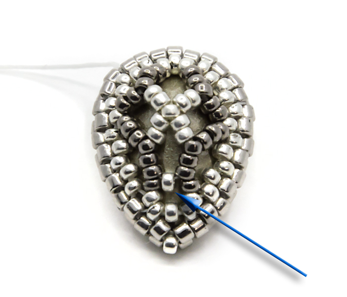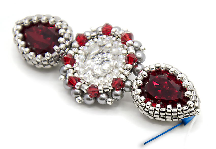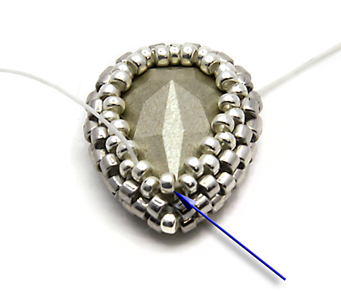11. Проплетаем круглой пятнашкой второй ряд, не забываем стягивать ряды, ряд завершаем одной бисеринкой во внутреннем уголке, на которую указывает стрелка. На этом этапе кристалл уже хорошо держится и дальнейшие действия нужны для красоты обратной стороны серег, а так же для защиты фольгированного слоя кристалла от царапин и падения:
