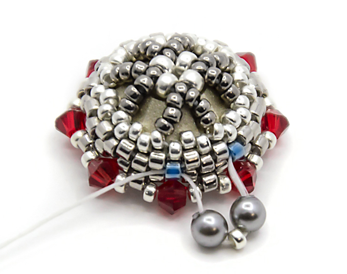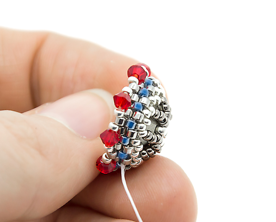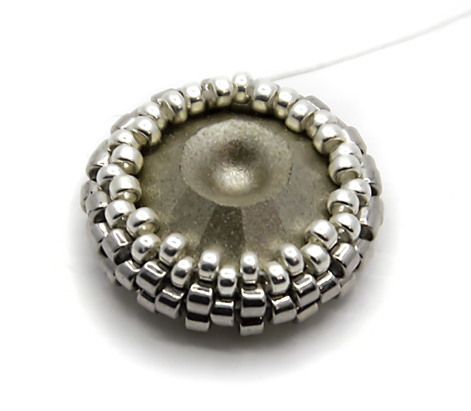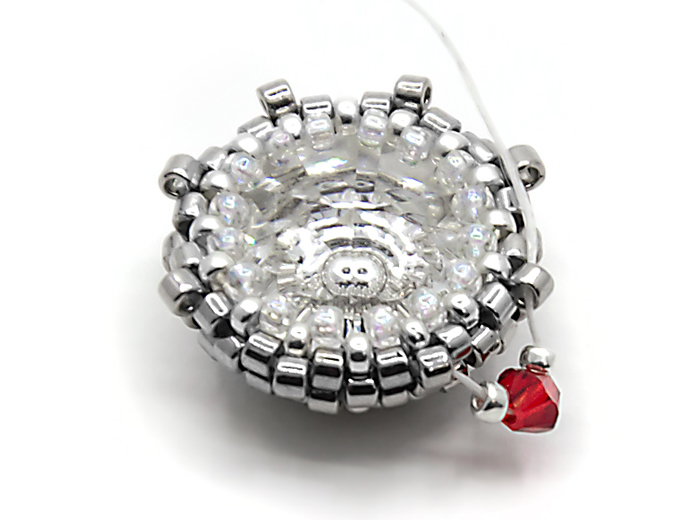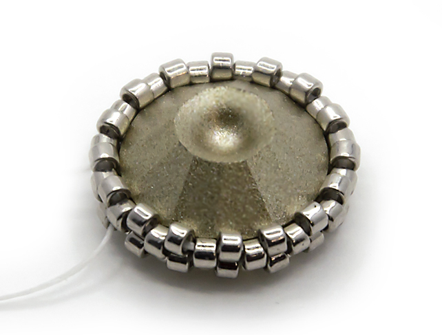 20. Проплетаеммозаичным плетением последний ряд. Для этого ряда я взяла прозрачный бисер, он подойдет к кристаллу выбранного цвета. Не забываем стягивать нить.