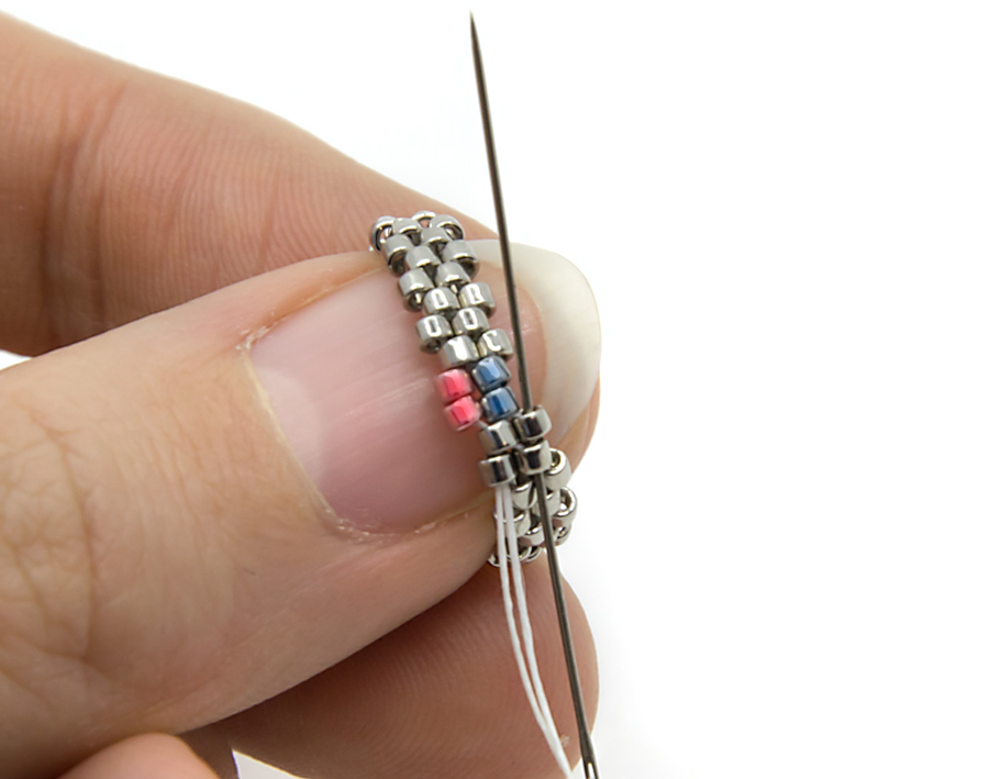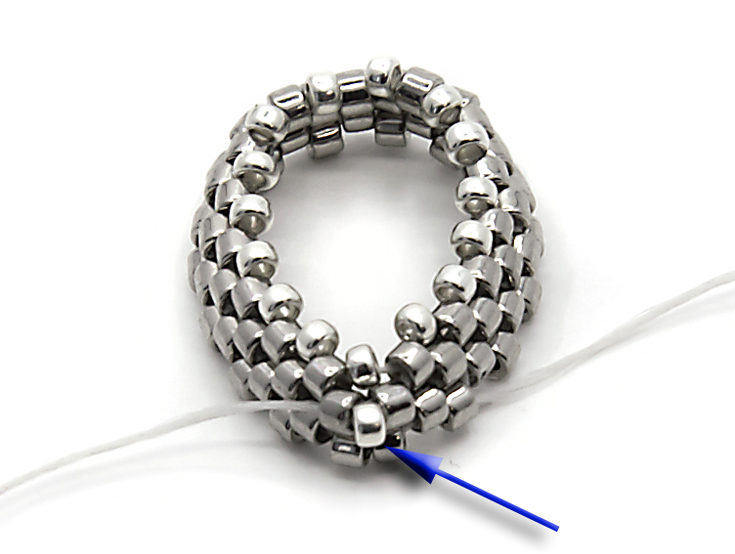 5. Переводим иглу на первый ряд через соседнюю бисерину, развернувшись на 180 градусов: