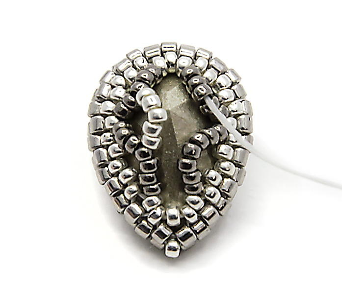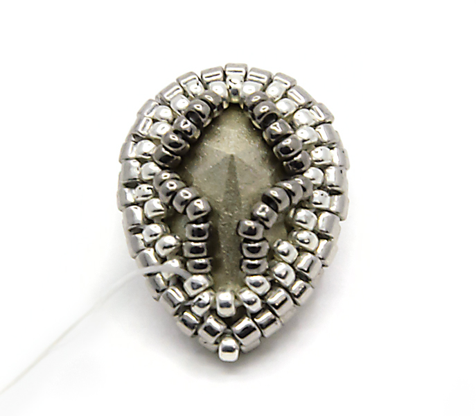 9. Начинаем оплетать изнанку. Переводим нить на обратную сторону и уже можем примерить капельку Сваровски в оправу: