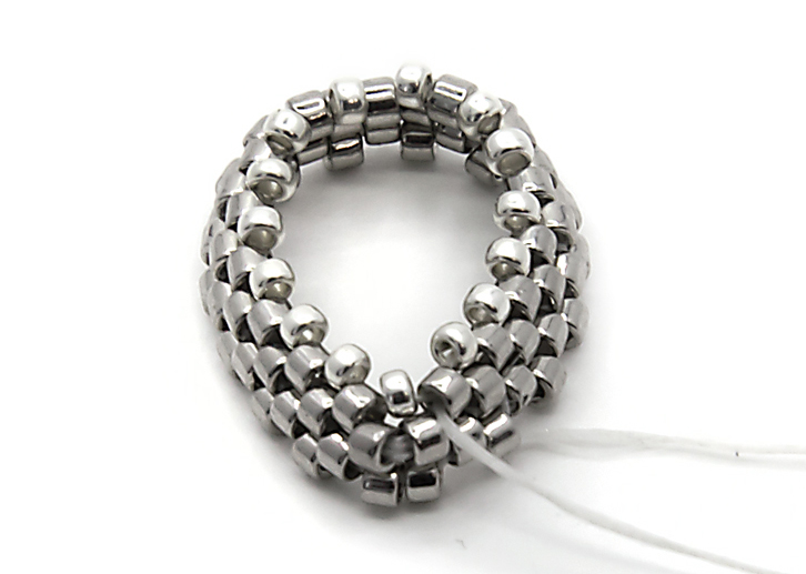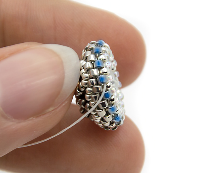 19. Берем круглый бисер 15/0 и проплетаеммозаичным плетением еще один ряд, не забываем стягивать нить.