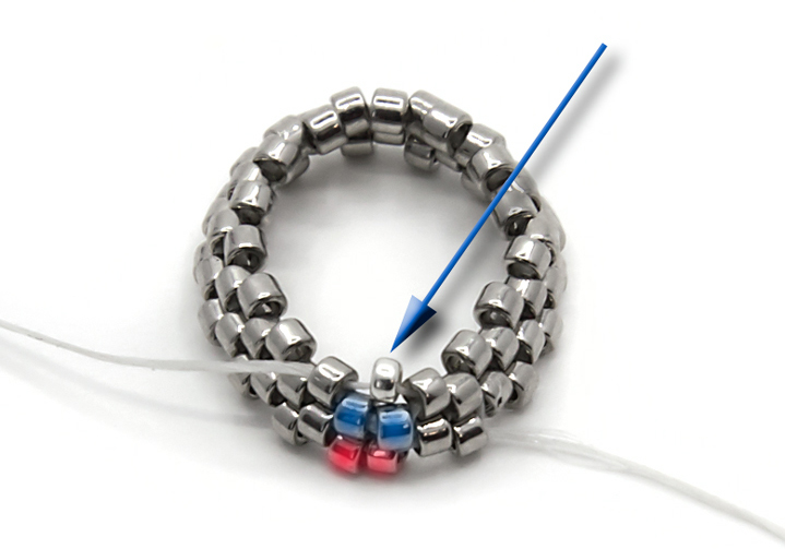 14. Формируем последний мостик: набираем две бисеринки пятнашки (верхние синие), проходим через вершину предыдущего мостика, набираем еще две бисеринки пятнашки (нижние синие). В результате мостики имеют общую вершину (выделена красным).