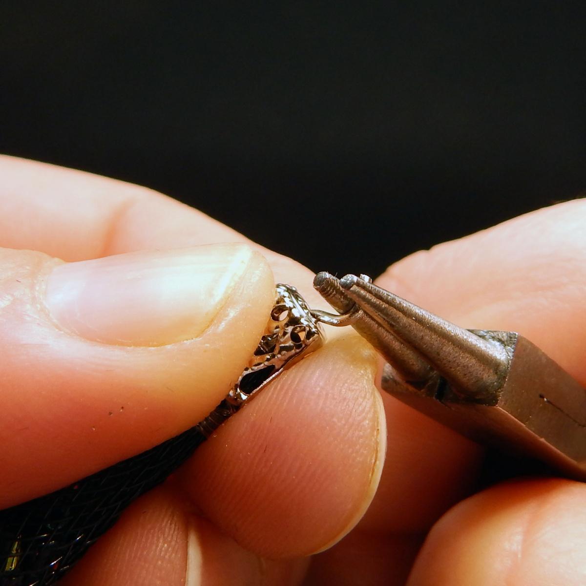 Круглогубцами закручиваем колечко, не забывая в процессе на это колечко одеть вторую часть застёжки