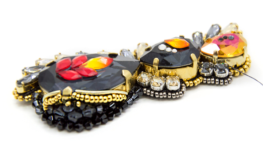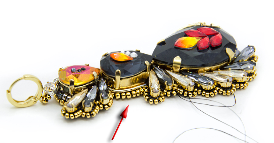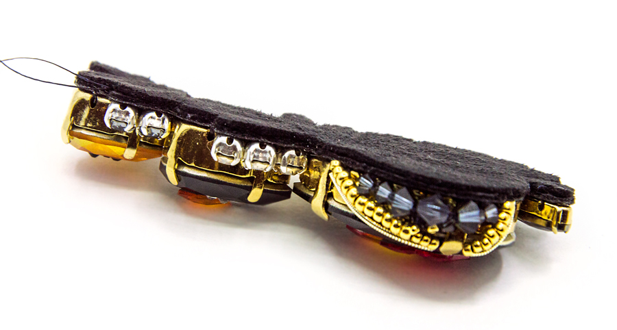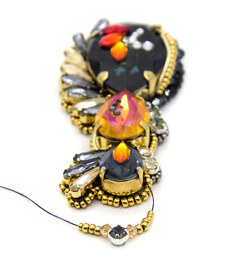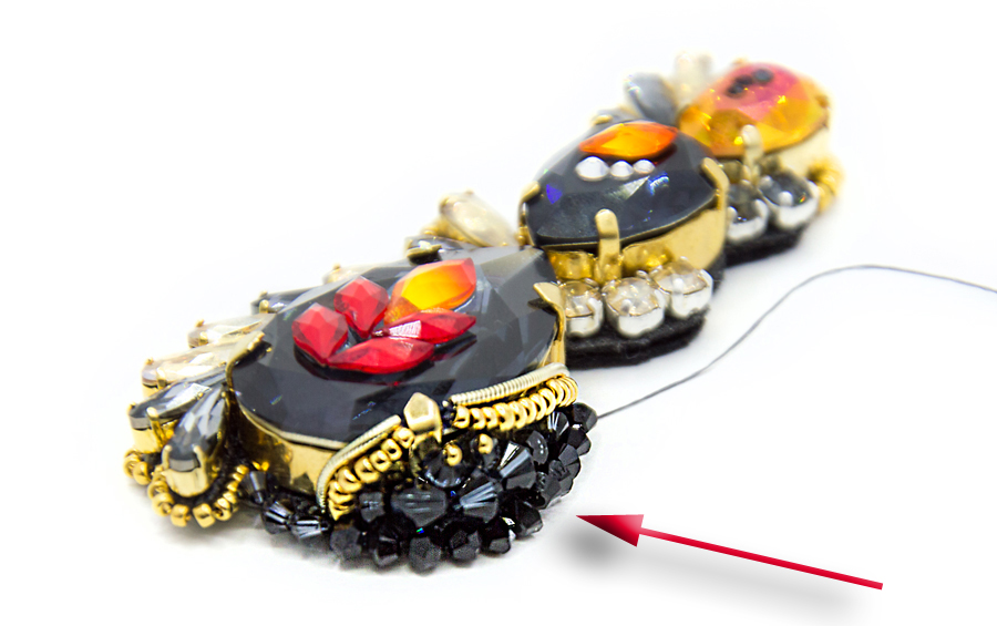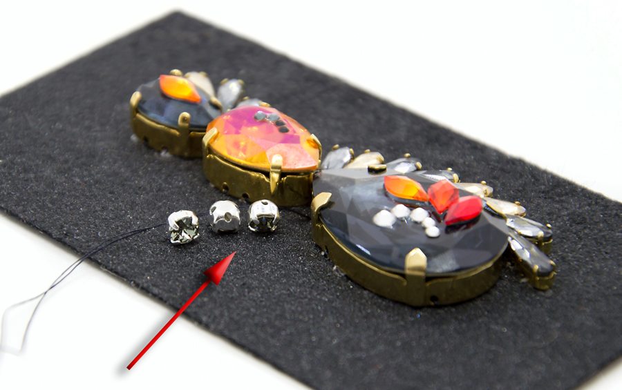 Пришив все основные кристаллы, несколько раз проходим нитью через дырочки в оправах, чтобы наверняка ничего не сдвинулось: