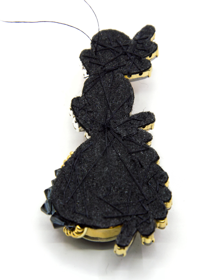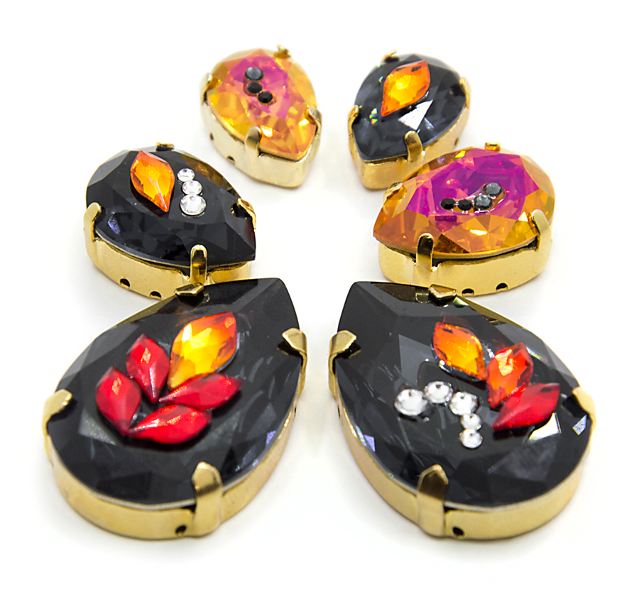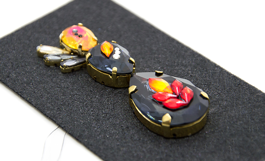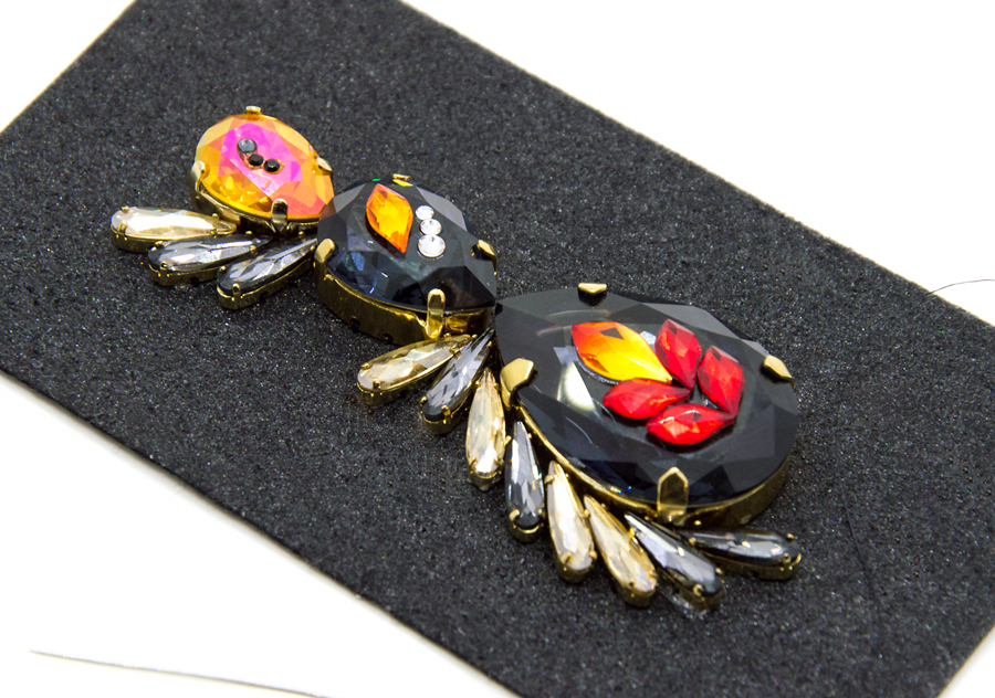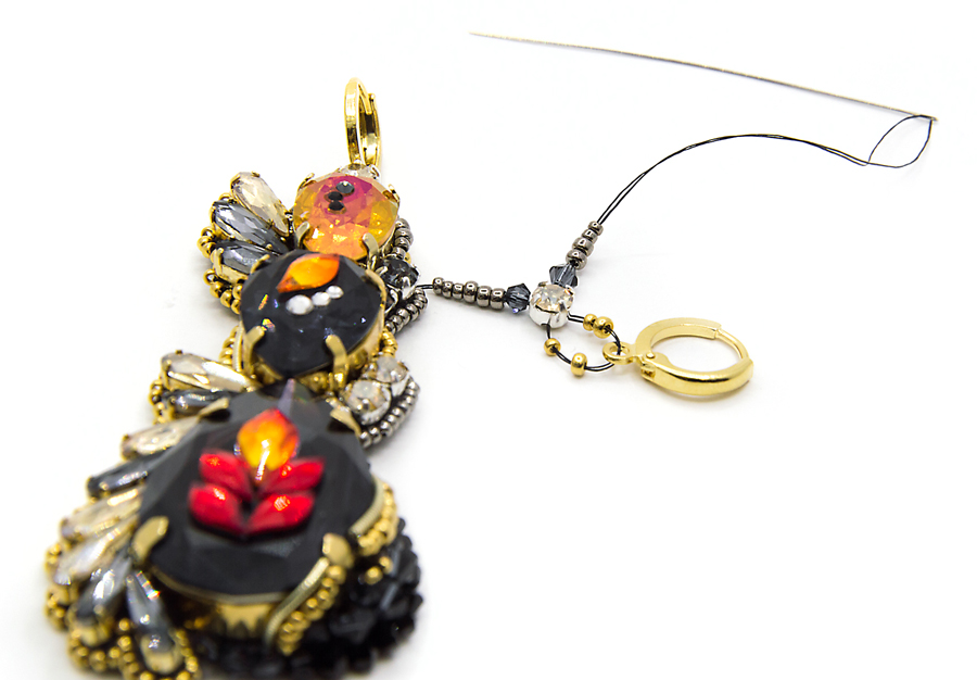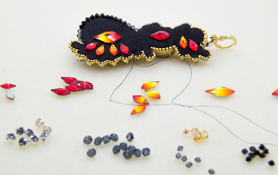 Пришив все основные кристаллы, несколько раз проходим нитью через дырочки в оправах, чтобы наверняка ничего не сдвинулось: