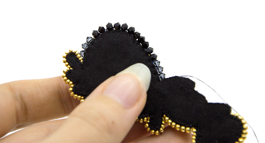 7. Аккуратно обрезаем фетр максимально близко к кристаллам, повторяя каждый изгиб, очень стараемся не задеть нити: