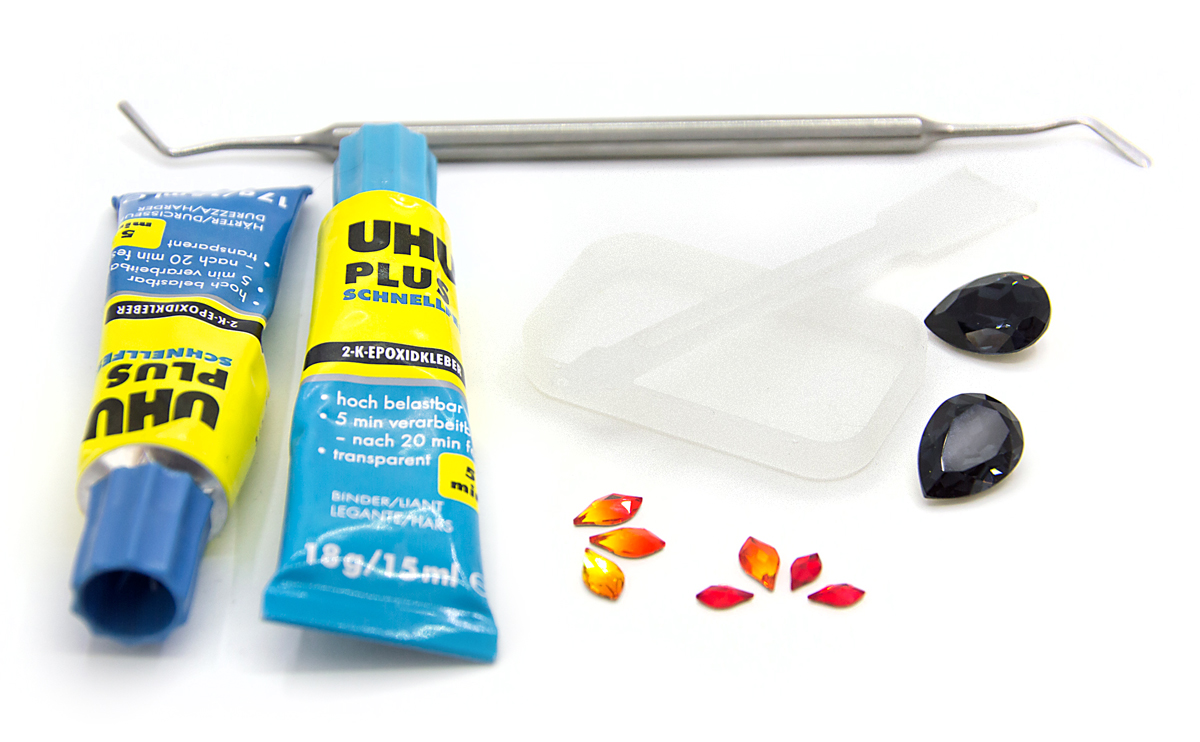 - Нанести точками клей на место будущего страза, лучше под все стразы на одном кристалле разом. Наносить очень мало клея, иначе вытечет по углам.
