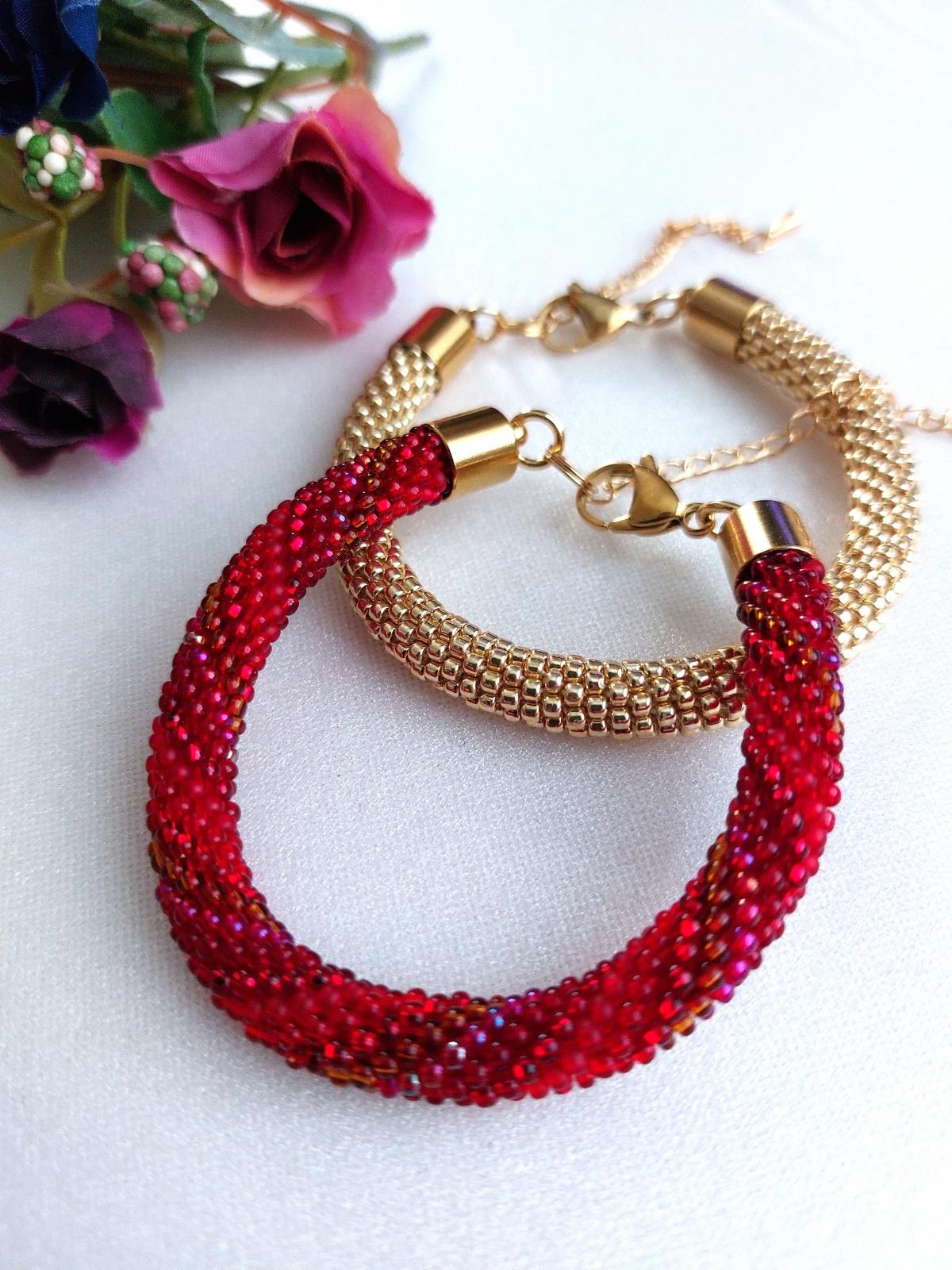 Просто парочка браслетов. Однотонный из золотого TOHO 11/0 и красный из микса красных оттенков и фактур чешского 10/0. Застежки из нержавеющей стали под золото, карабин с удлинительной цепочкой. На обхват 15 см на заказ двум чудесным дамам.