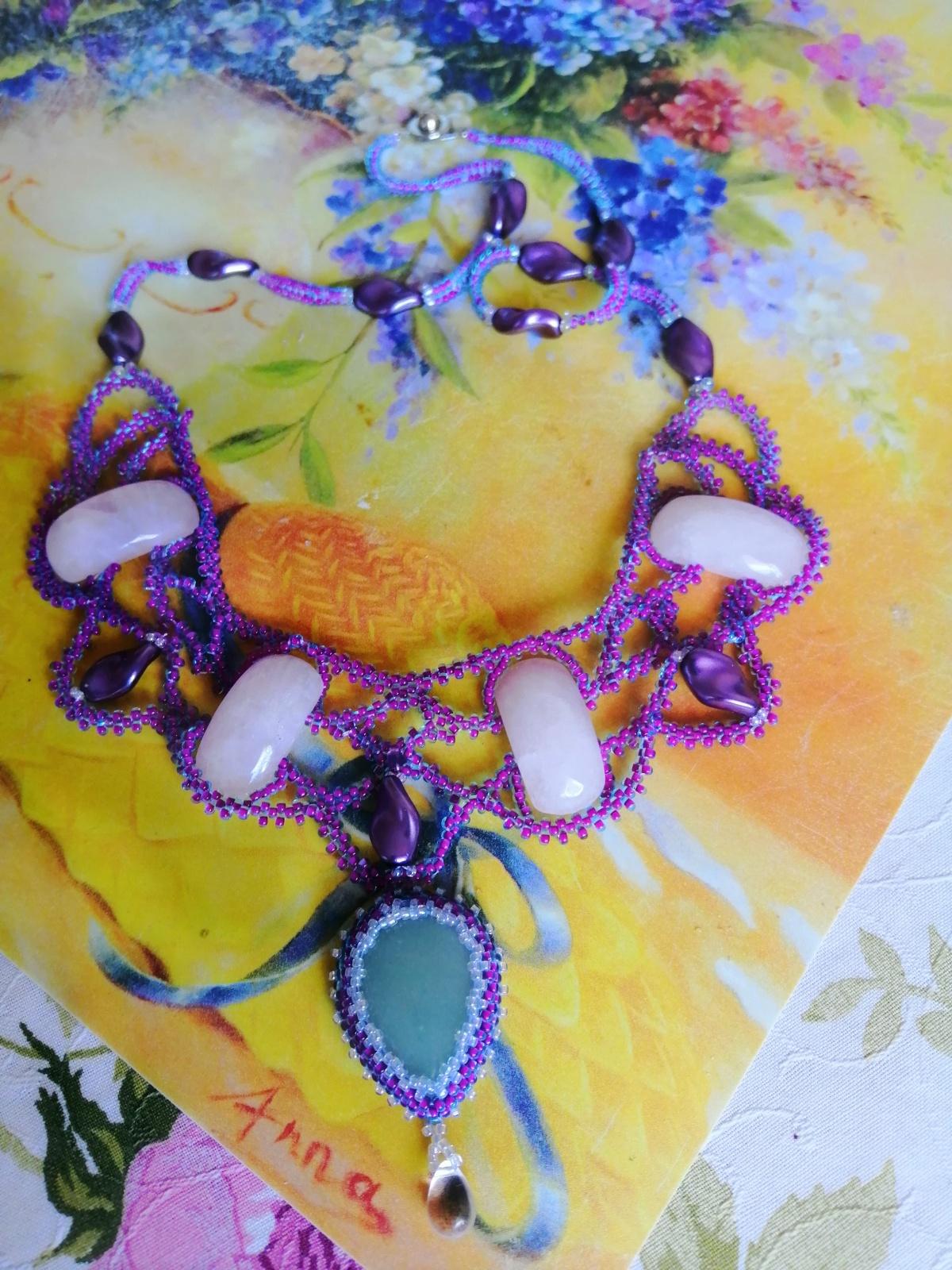 Хотелось ажурных нежных линий. Думаю, что получилось. А все из за невозможности удовлетворительно оплести бусины из розового кварца. День мучений привёл к простому решению. Использовать отверстия в бусинах, чтобы они, эти самые бусинки, сыграли роль твинов в сборке. После этого задумка быстро реализовалась.