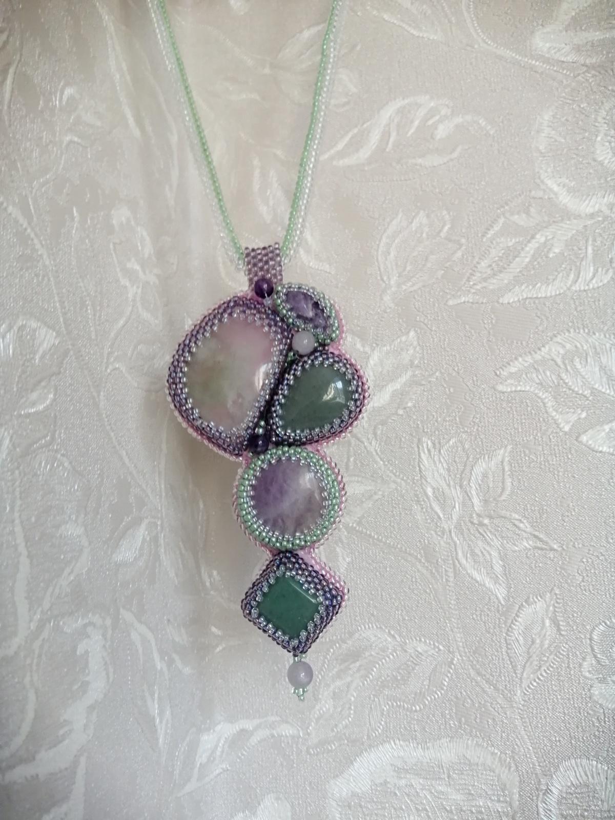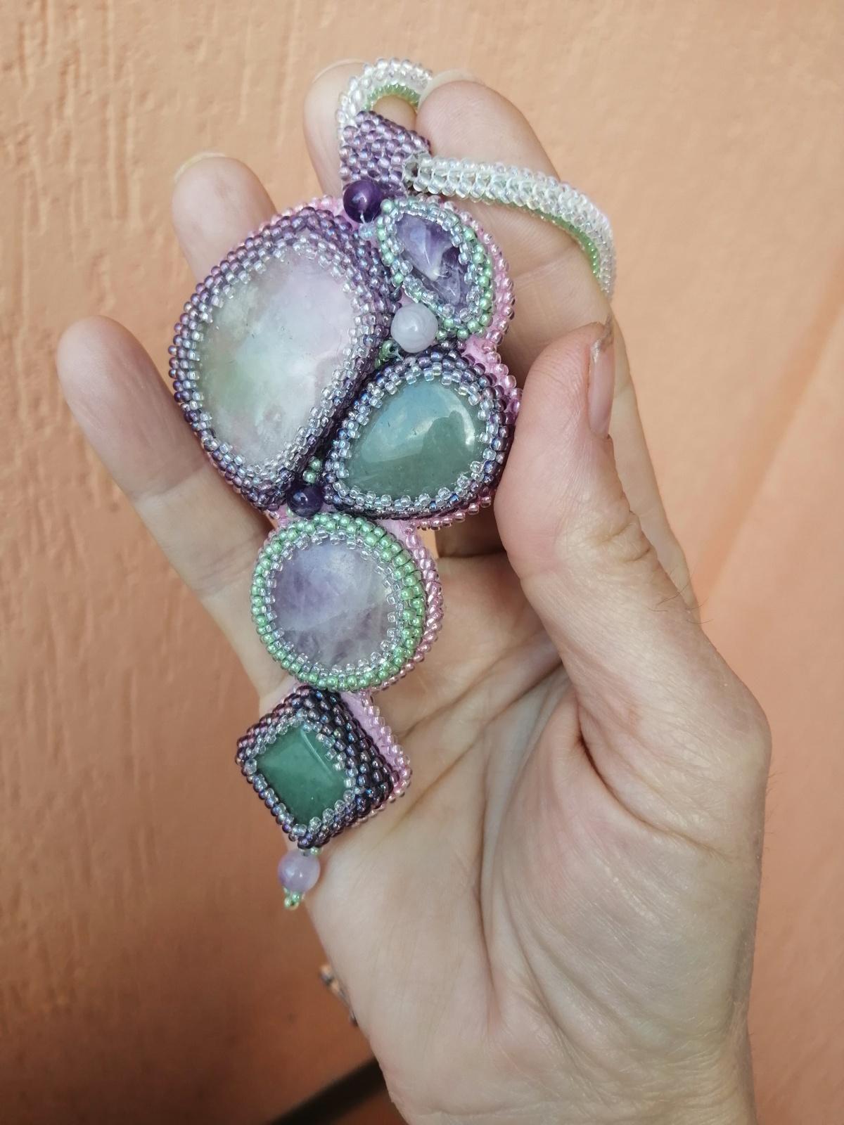 Флюорит давно уже скололся и не получалось его ни как обыграть. А тут вспомнила, что у меня есть в тон кусочки аметиста. Ну и пришлось поддержать крупной бусиной аметиста. А уж как туда попал зелёный авантюрин, даже и не пойму