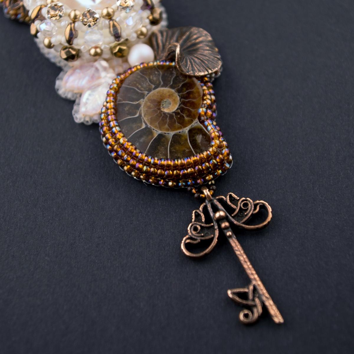То что часть аммонита не оплетена — так надо! Иначе бы фурнитурина не легла, пришлось вот так по хитрому уменьшать плетение.