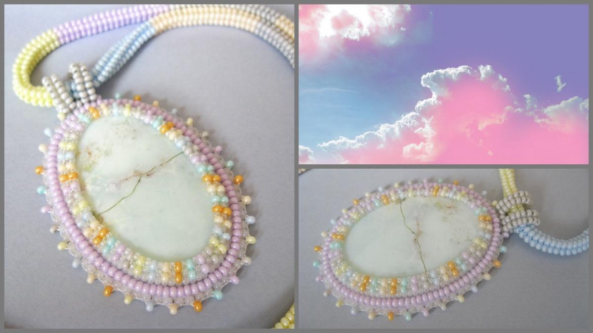 Камушек хризопал, в котором я сразу увидела облака с отраженными в них весенними первоцветами. Отсюда и выбор бисера в пастельных тонах. Идею чередования цветов в цепочке ндебеле подсмотрела как-то у О. Перминиене, сюда она по-моему неплохо подошла. Бисер чешская 10-ка и чуть 15-ки Тохо.