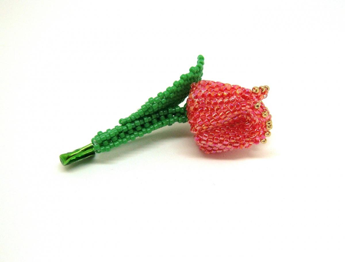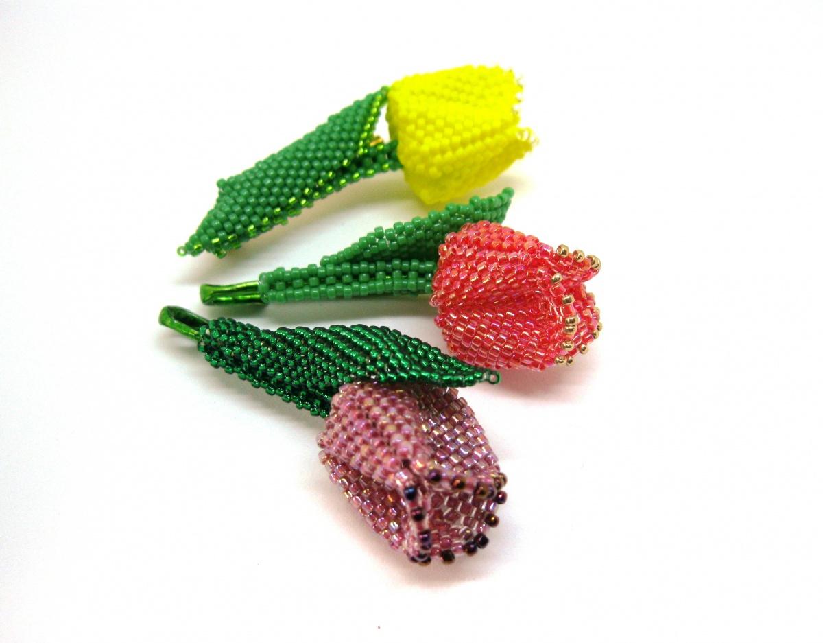 В двух брошках для застежки использовала булавки, случайно попались в наборе цветные, среди них зеленого цвета. В одном тюльпанчике обычная застежка. С листиком у всех трех экспериментировала.