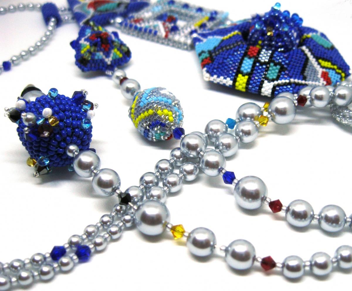 Моя выпускная работа по курсу Бисерный ликбез 2018, который проводила Ann Braginsky в Инстаграм. Курс обучения продолжался 9 месяцев, все как положено: с домашними заданиями, оценками в виде звездочек, сдачами и пересдачами д/з. Очень интересно, много полезного, нового, хотя и немного напряжно. 9 месяцев, сами понимаете, срок, в результате и родился этот лариат. Роды, надо сказать, были нелегкие, лариат рождался в муках. Тема «Геометрия», формы отдельных элементов, порядок их соединения, их размеры — немаленькие, материалы — главным образом delica — были заданы. А вот все остальное: идея, схемы, рисунки и т.п. — муки творчества. Размеры лариата меня изначально смущали, т.к. в принципе не ношу крупных украшений, поэтому я даже частично переделала центральный элемент, уменьшив его размеры. Но когда собрала и примерила, оказалось, что все вполне гармонично.