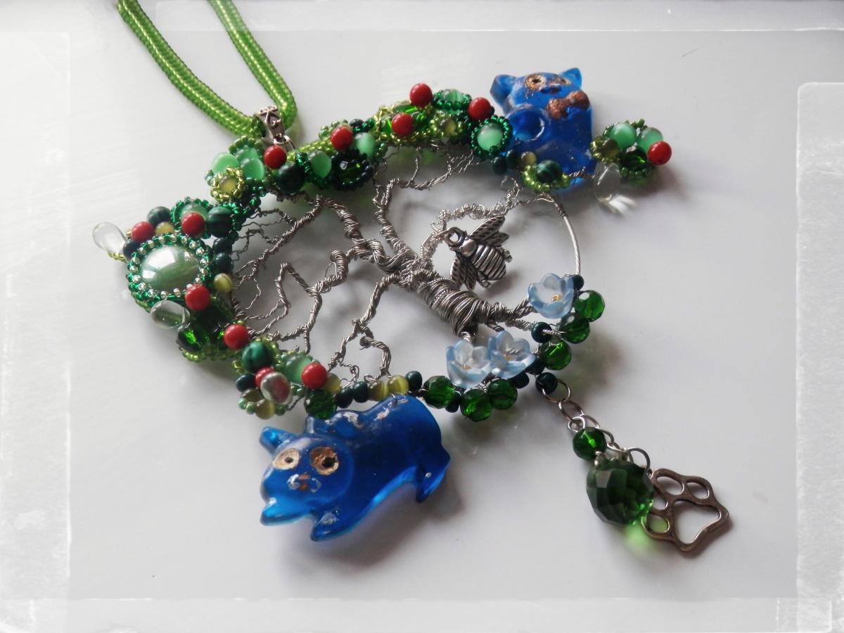 Все не знала куда их пристроить, так они мне нравились что лежали всегда под рукой, и наконец то дождались! А красивый кабошон, большая капля внизу и подвеска-лапка, бусины «кошачий глаз» и голубые цветочки дарила Ирина Полночь
