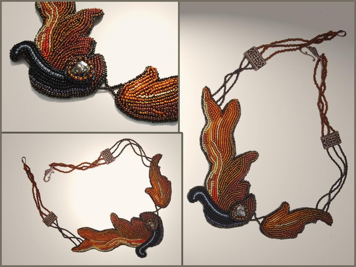 «Костёр для ведьмы» отжала моя подруга и активно носит, что не может не радовать. Надо сказать, она и на «Рассвет весны» покушается, но я не отдаю) Хотя определённая логика в этом есть: все эти три колье, по сути, составляют серию из стихий: вода, огонь, воздух. Пока не хватает земли, но, наверное, когда-нибудь будет и она.