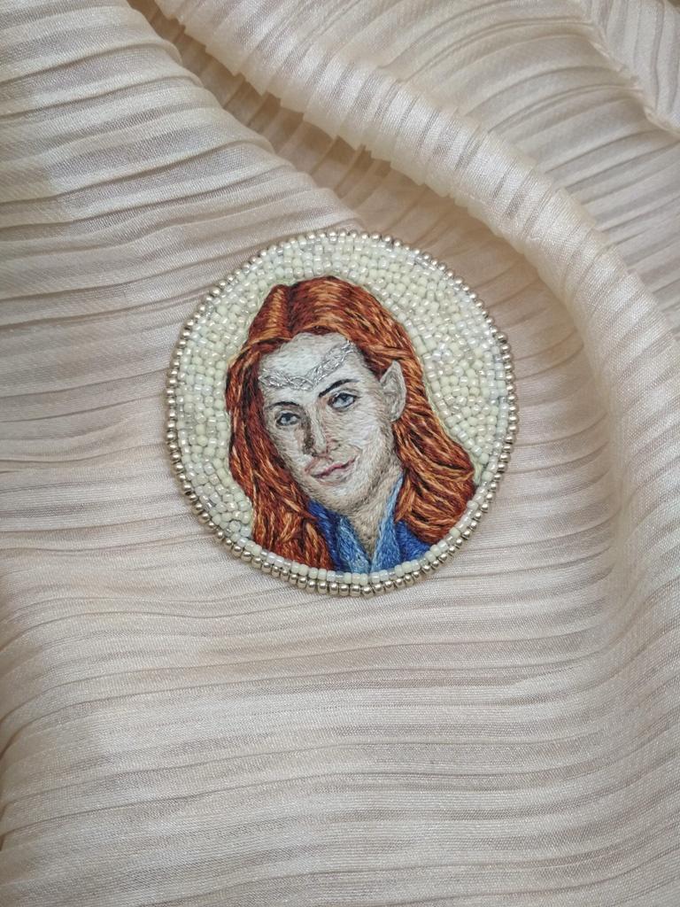 А это вторая работа для команды Robin Hood. Оригинальное название звучит «Кошмар Торина Оукеншильда». Объяснение довольно сложное… Если вкратце, то вышивала я с должным образом обработанной фотографии Ричарда Армитажа — актёра, сыгравшего в сериале Robin Hood BBC Гая Гисборна, а в фильме Джексона The Hobbit — Торина Оукеншильда. Гнома. Который люто ненавидит эльфов) Однако ж совсем юный Армитаж смахивал именно на эльфа, посему на броши стал эльфом) А ещё для игры писался текст, и там эта схожесть тоже обыгрывалась. В общем, всё запутанно) Картиночку я делала из фотографии, парика, костюмчика Леголаса, эльфийских ушей и не-помню-откуда-взятой диадемы. Тоже всё сложно)