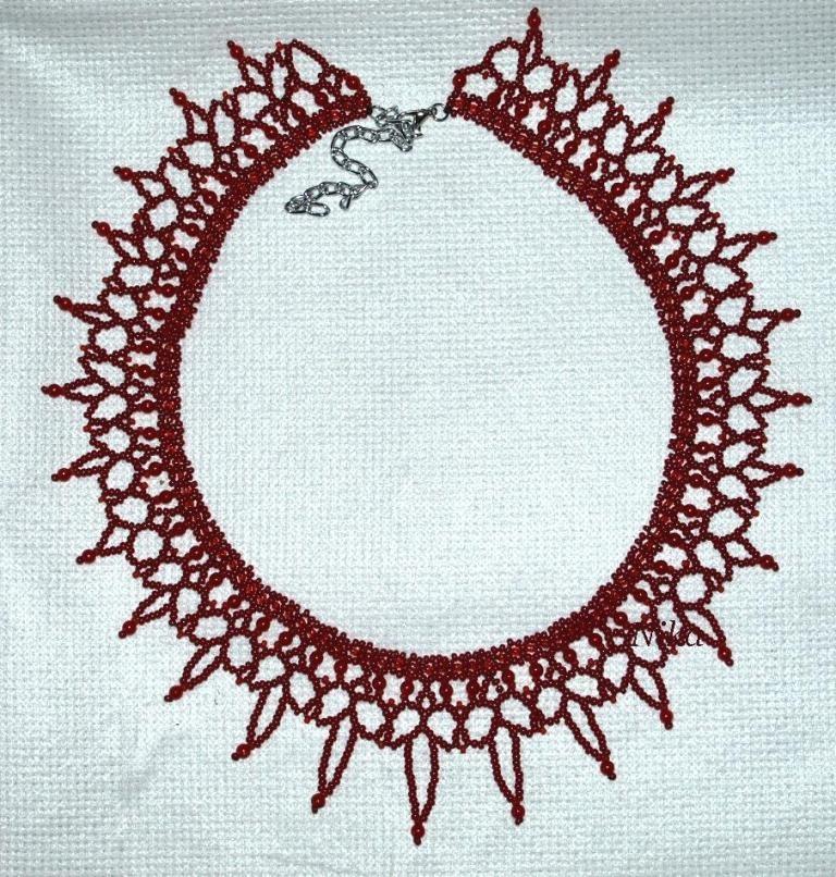 Сплелось колье -сеточка по схеме Сандры Хелпенни, конечно, не получилось в точности по образцу, видимо, бисер не тех размеров.Солнышка на улице нет, пришлось фотать со вспышкой и без нее.