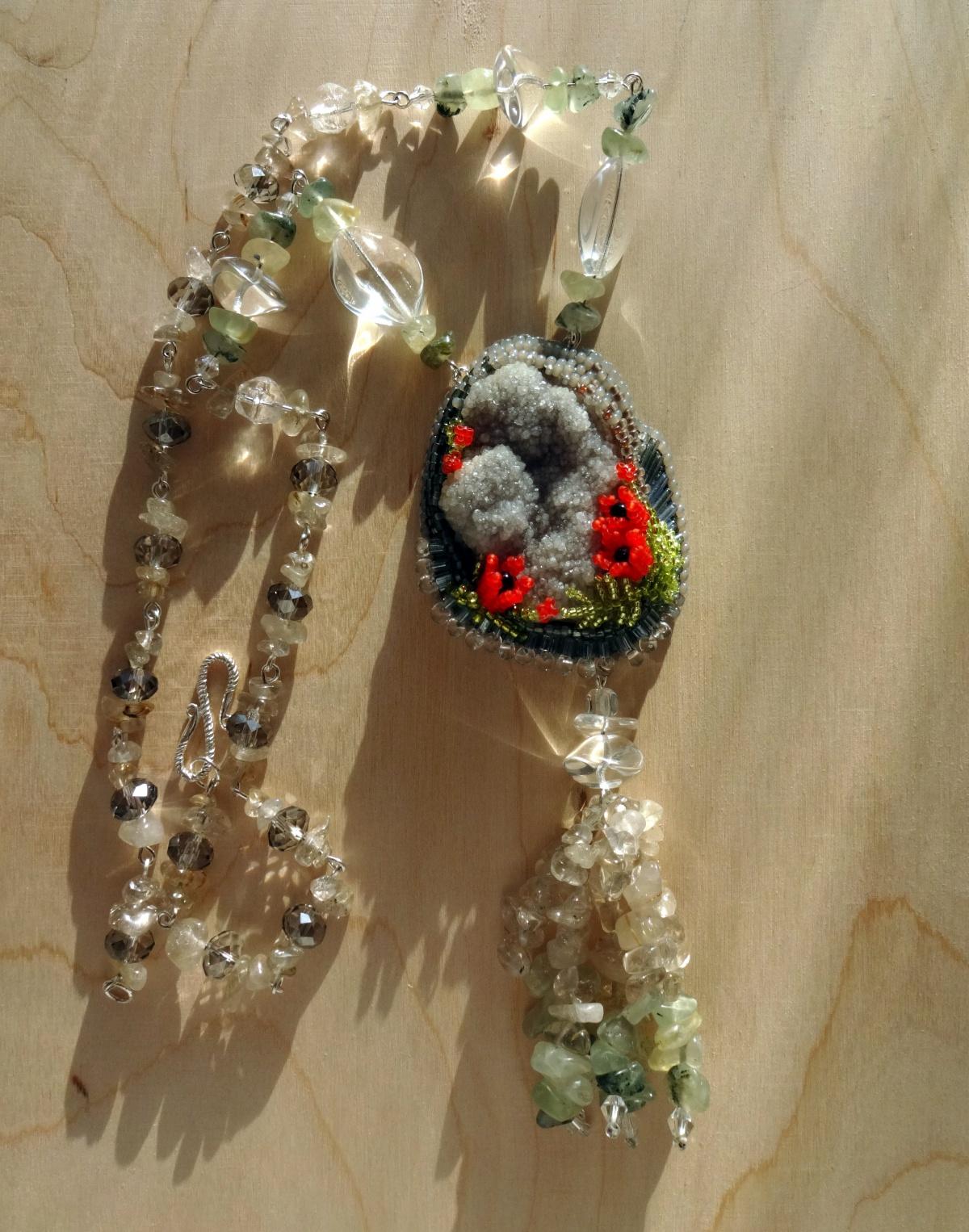 Срез филлипсита был с природной проплешиной, которую надо было как-то закрыть. Решила задачу таким способом) В детстве была у подножия вулкана на Камчатке и помню там странные цветы, растущие на голой чёрной вулканической лаве — небольшие кустики в диаметре 10-15 см, очень сильно расплющены по поверхности, как будто катком по ним проехались. Может, от частых ветров, сильного жара, исходящего из-под земли, и резких перепадов температур днём и ночью они так защищались. Цветки были вытянутые и каждый кустик разного цвета, вроде одной породы, но одни были малиновые, другие жёлтые, третьи фиолетовые… Инопланетные какие-то… До сих пор ничего подобного не видела и сколько ни искала в интернете, так и не нашла похожих. Этот кулон напомнил о Камчатке — цветы на камнях с ледышками из кварца)
