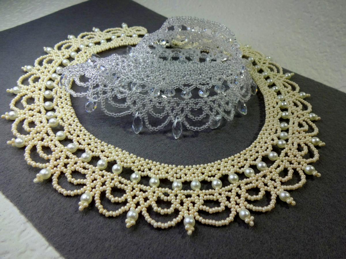 А эти два колье делала без схемы, так как она давно утеряна, остался лишь кусочек, сплетённый лет 15 назад. Выбросить было жалко, потому что красивое плетение, вот теперь, наконец, глядя на него, сделала полный вариант в двух цветах))