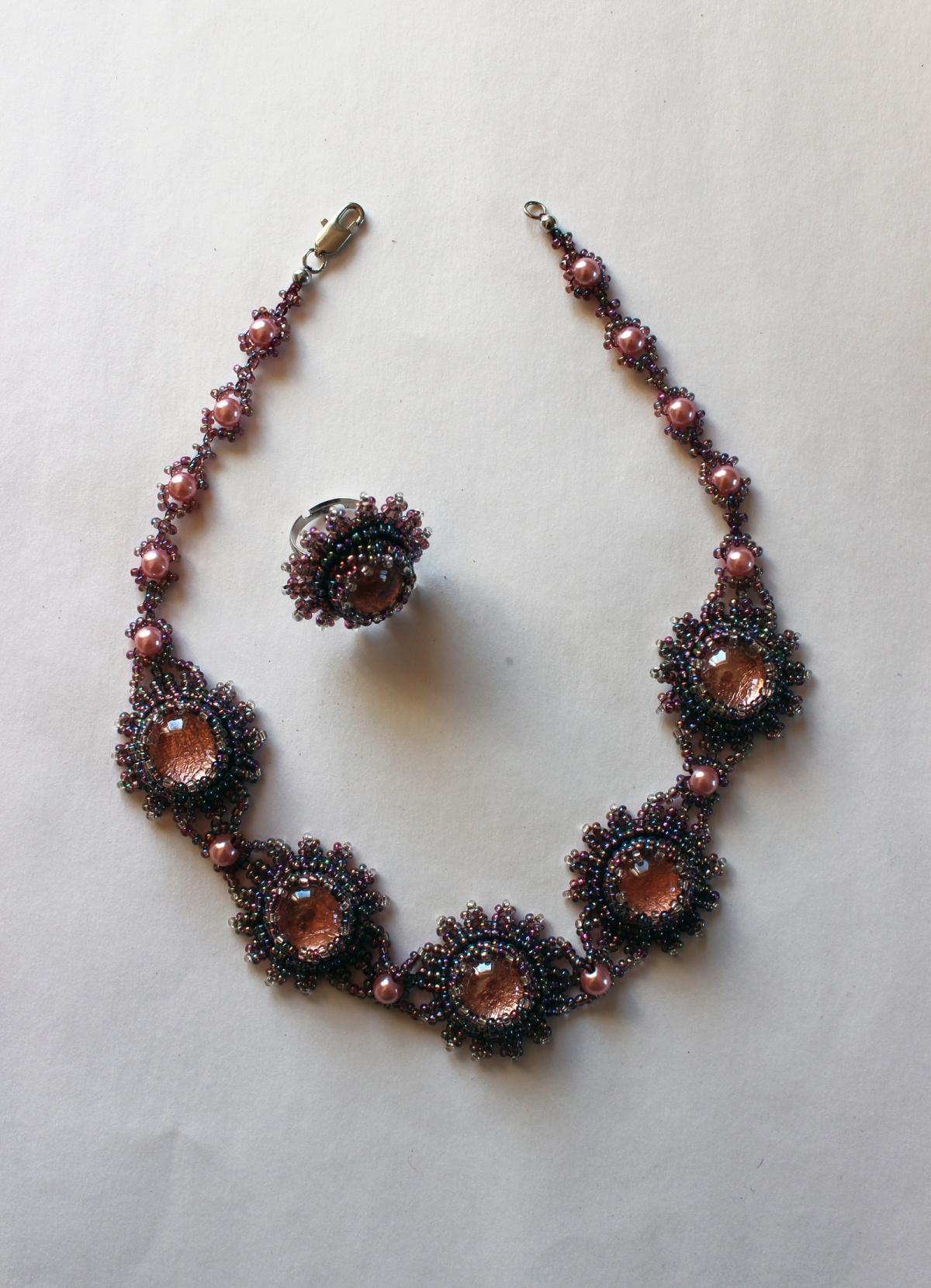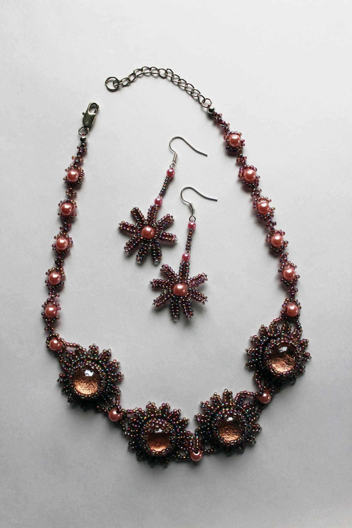 Вариант опубликованного ранее комплекта, отличается количеством цветочков и вместо кольца сделаны серьги. Для сравнения новый на 4 цветочка и старый на 5. Один собственный, второй заказной. Хотелось бы узнать мнение коллег, как все-таки лучше???