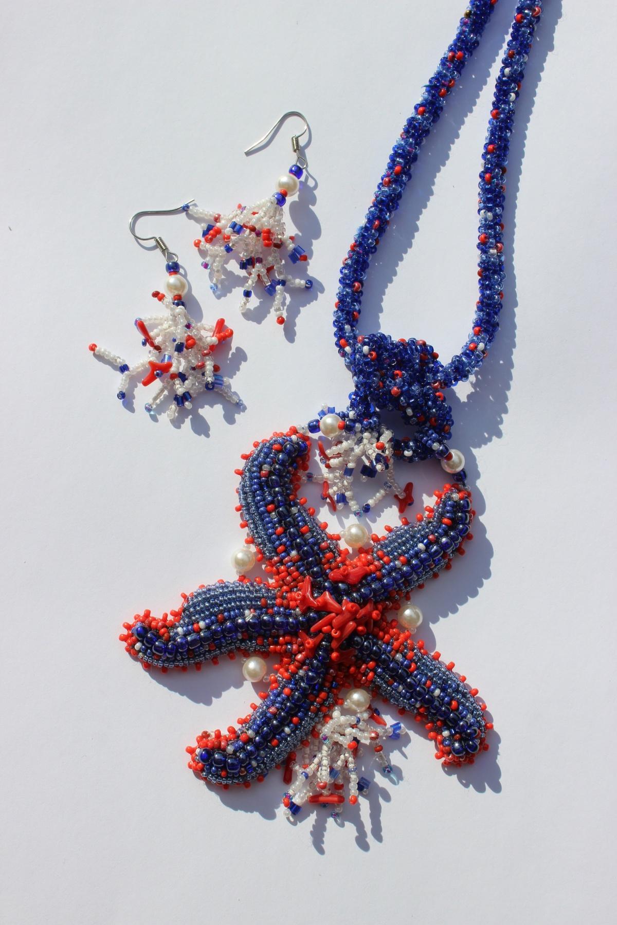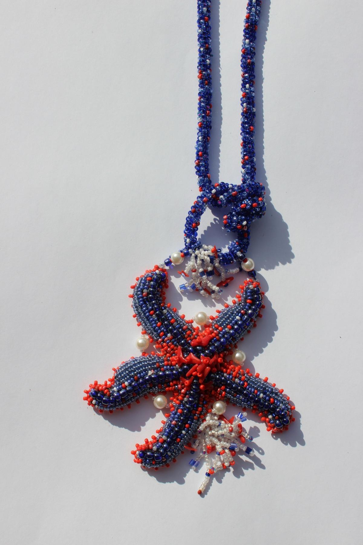Первая мысль была назвать изделие, конечно же, «Морская звезда»)) Но у меня их было столько, что я уже сама запуталась, где которая!)) Работа в несвойственном мне репертуаре, я редко делаю крупные кулоны или колье. Но это первое, что пришло в голову при подготовке к выставке! «Звезда должна быть большая!!!», — сказала я и принялась за работу. Фото много, потому что хотелось представить разные варианты узелков на шнуре, хочу так, а хочу сяк!