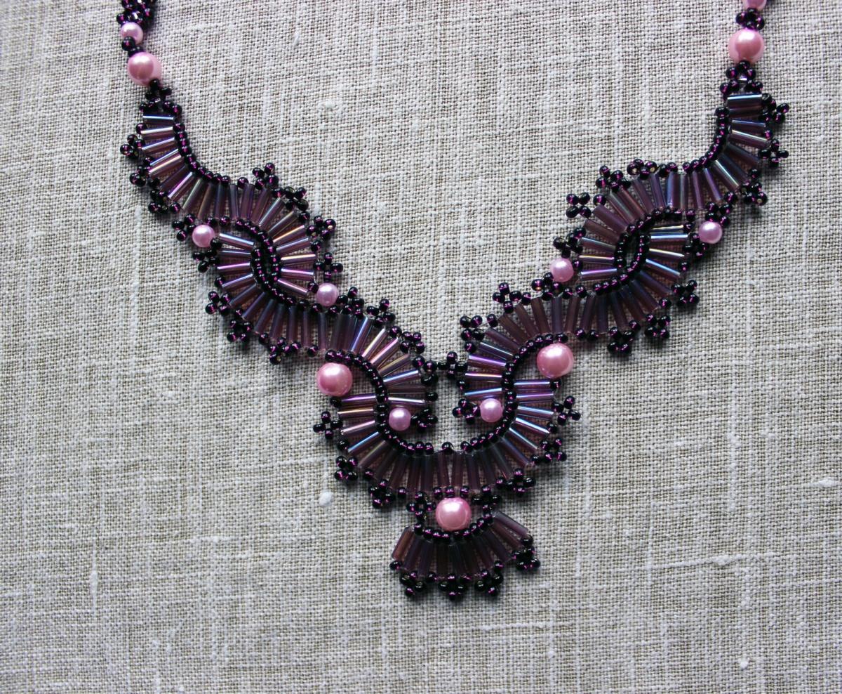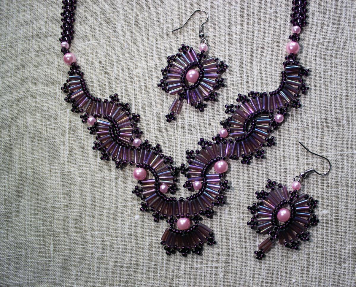 Еще один простенький комплект, который не захотел показать на фото всю свою фиолетово-радужную переливчатость)). На самом деле на солнце просто глаз режет (за счет стекляруса). Элементы «жабо» плести быстро, но вот собирать все это в колье, да еще на мононити… Долго, нудно, но надо))) У меня был похожий из китайца, бело-золотой, но уносила я его вусмерть, реставрировать нечего, легче сделать новый, но уже из чеха)).