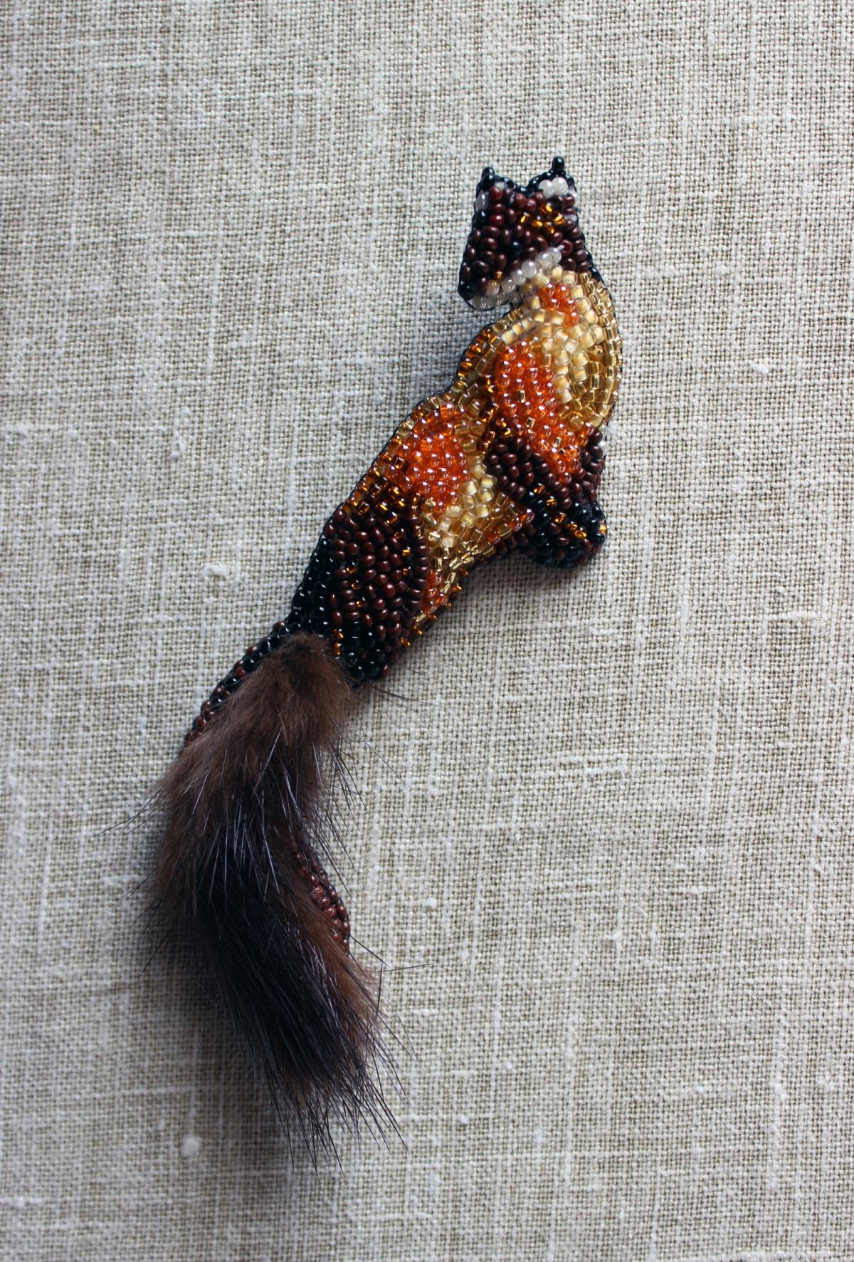 На сей раз, продолжая «меховую» тему, изготавливала брошь в виде конкретного животного: это харза или желтогрудая, или уссурийская куница. В природе не такая яркая, но оранжевые оттенки подошли сюда больше, чем те желтые, которые у меня были. Ну, и хвост не такой прилизанный, как в оригинале)).