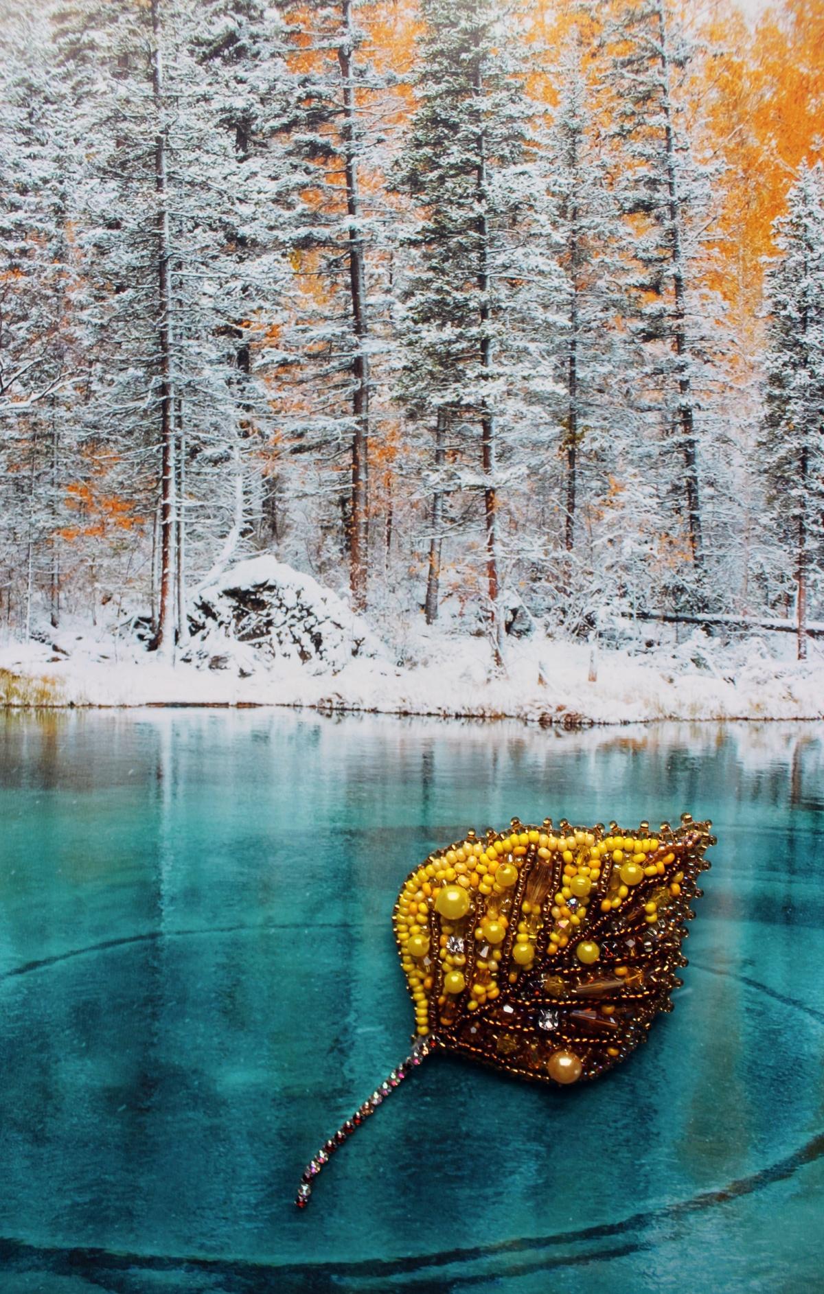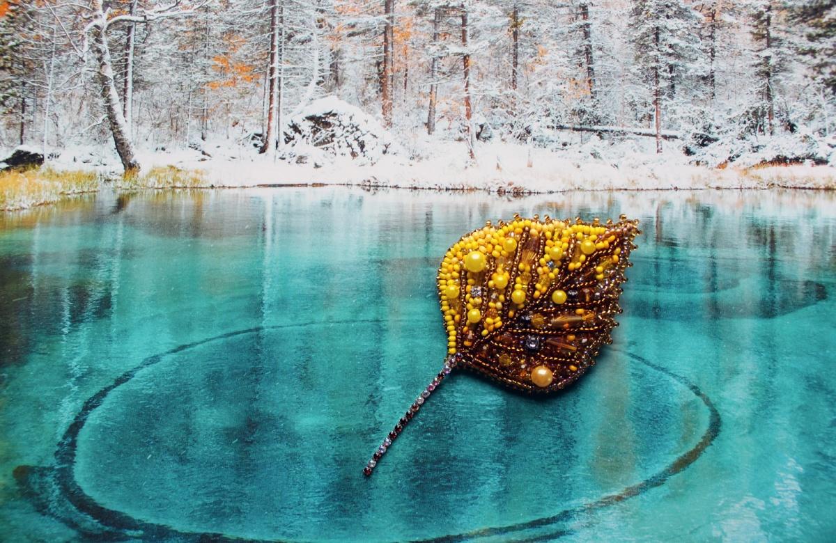 Листик прелесть… как настоящий ! Отлично вписался в алтайскую осень… Пролетел над горной рекой и закружился в узорах Гейзерного озера